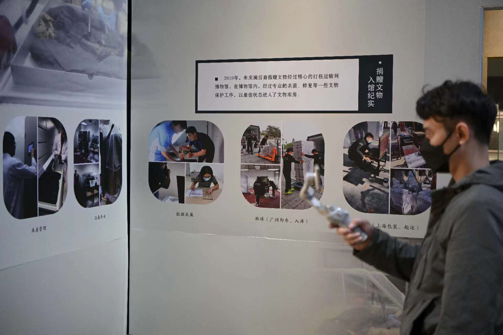 展览中的文物保护专区展现了朱庆澜亲属捐民国黑色缎面羊毛里长袍修复的过程。汪喜介绍,当时拿到这件大衣的时候,除了有一部分霉腐之外,还有大量的虫咬、鼠咬的痕迹,整体情况不容乐观。经过修复后,现在展示出来的大衣和之前完全不同。“捐赠人视若珍宝的藏品捐赠给我们馆之后,会得到一个非常好的安顿和处理”,汪喜说。