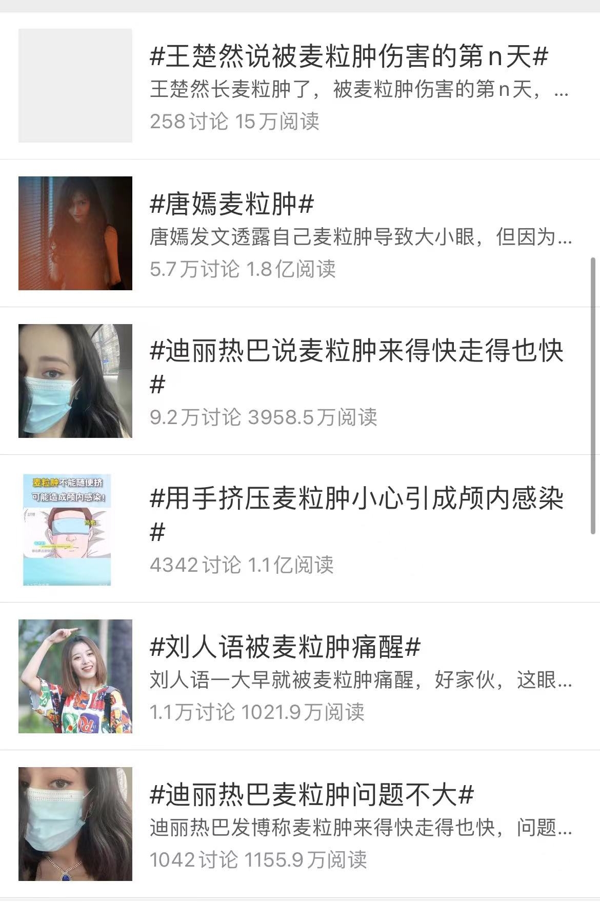 这两天,有一位女艺人因为眼晴长了麦粒肿而上了热搜。小编掐指一算,发现麦粒肿真是一个艺人喜欢官宣的病种~~