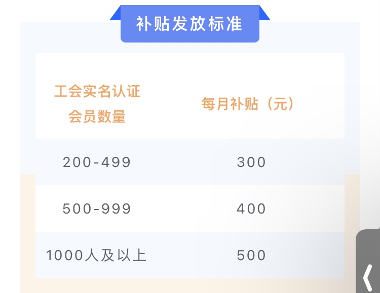 具体补贴标准:工会实名认证会员数量为200-499人的,每月补贴300元;工会实名认证会员数量 500-999人的,每月补贴400元;工会实名认证会员数量 1000人及以上,每月补贴500元。