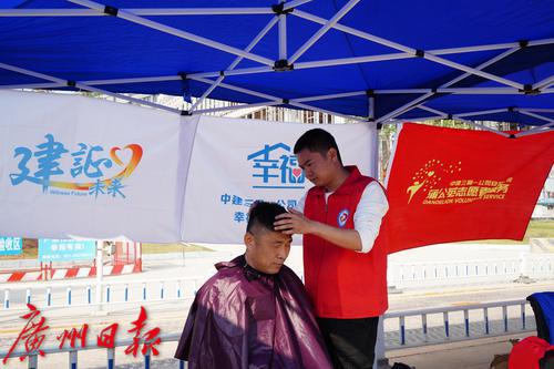 当天,活动现场还布置了“爱心义诊”“应急教育”等摊位,邀请了广州医科大学附属第五医院的主治医师、蓝天救援队的专业讲师,分别为工友们提供了免费针灸理疗、健康咨询等义诊服务和高温中暑等情境下的应急处置“沉浸式小课堂”,受到了工友们的欢迎和好评。“没想到剪发的手艺还能给工友们带来便利,以后我还要继续给大家服务!”来自中建三局一公司的青年志愿者黄朝昇是一名退伍军人,在部队里他自学了剪发的手艺,在活动现场也派上了用场,为3名工友提供了理发服务。“项目上很多工友都是来自外地,我们结合他们的真实需求,将一系列便民服务送到他们身边。”中建三局一公司项目经理朱根芽介绍到。“未来,我们会持续开展更多关爱活动,让工友足不出户也能感受到关怀和温暖。”