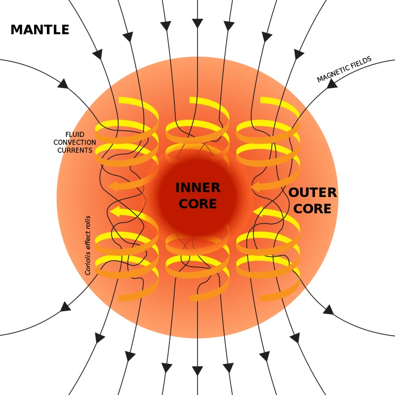 地球内外核相互作用导致地磁场产生的示意图。图片来源:Wikipedia