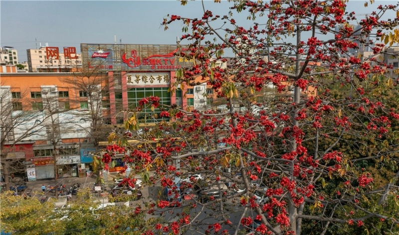 在广东外语外贸大学和白云湖街夏茅村,木棉树满树花朵鲜红似火