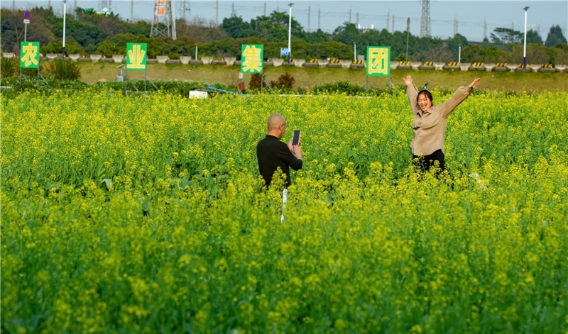 一路向北,在人和镇镇湖村相思街,80亩油菜花进入盛花期,放眼望去,大片金黄色的油菜花争相竞放,不时吸引蜜蜂前来采蜜,或是游人驻足拍照。
