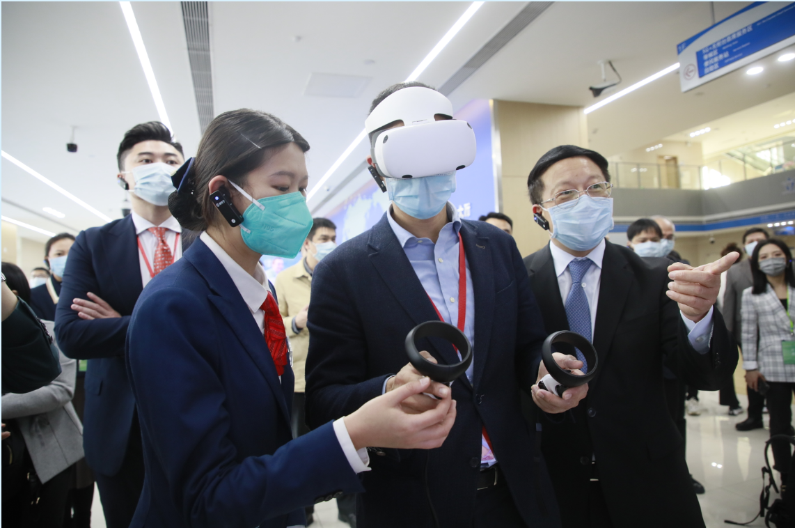 在广州南沙政务服务中心元宇宙政务大厅,参访团一行饶有兴致地连线“一对一”实时客服,现场体验“港澳身边办”等功能,纷纷点赞科技感十足的政务服务体验。