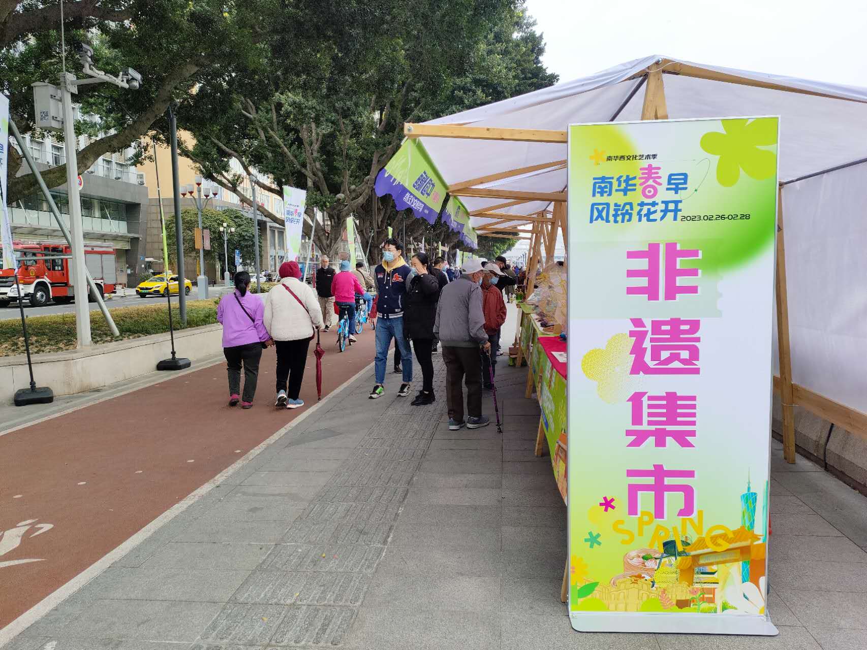 走出主会场,海天四望小游园以西的滨江西路沿线将连续三天设置非遗和旅游摊位。市集内容丰富多彩,尽显“广式”文化特色。除中华铜印、余同号(木艺)、小凤饼、中国草编、岭南剪纸等非遗文化展示外,还邀请南华西辖内企业参展。各摊位采用喜闻乐见的形式向市民游客进行展示、展演、展销,场面十分热闹。