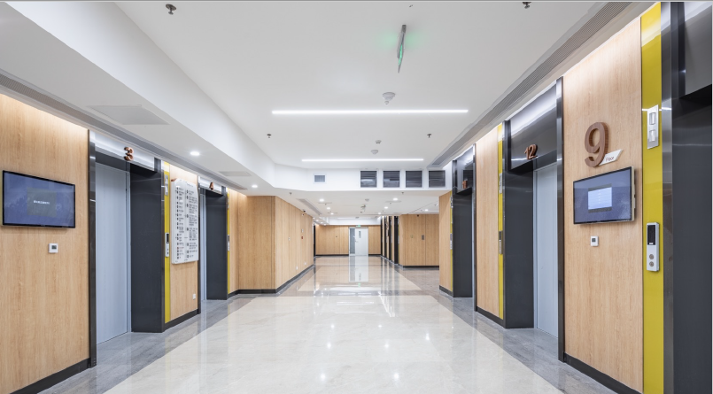 合理推敲竖向交通布局,采取两个护理单元共用一组中央交通核的方式,分设患者及医护电梯厅,扩大为病房、手术等频繁推床空间服务的病床电梯轿厢及门洞尺度,提高竖向交通运行效率并保护隐私。
