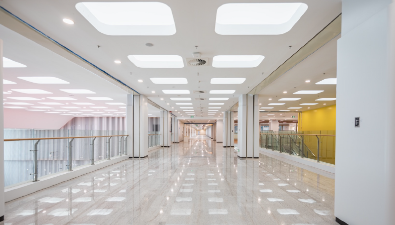 病房房顶采用冲孔铝扣吸音板和水泥纤维板,集隔音、吸音和消音功能于一体,在阻燃、防潮的同时兼顾美观。地面使用防菌地板胶,墙面采用医用PVC板,卫生间、淋浴间铺满防滑地砖并用防污、易清洁的瓷砖贴到顶。