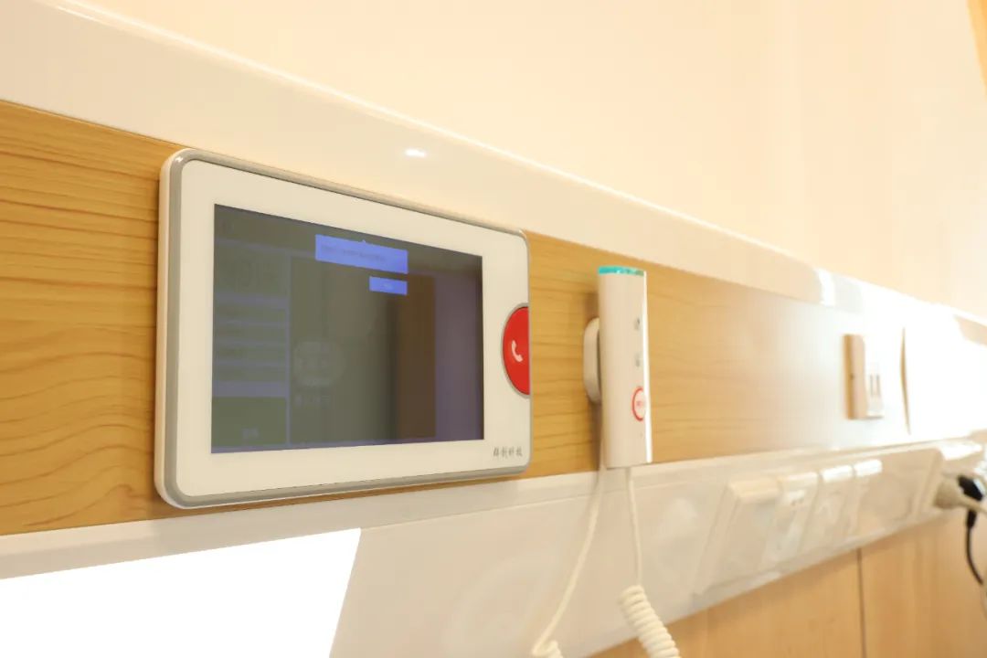 全数字医护对讲系统取代了手写信息和纸质卡片,不仅能显示住院患者基本信息、安全警示、饮食事项、健康宣教等信息,而且具备医嘱查询、呼叫医护、费用查询、检验报告、影音服务等功能,减少了患者及家属来回跑的次数。