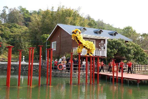 波光粼粼,上十根桩子错落有致地在水池矗立着,活动开始前,国家级非遗项目蔡李佛拳保护传承基地北胜蔡李佛龙狮团的两位师傅在水上高桩表演《勇闯悬崖显雄风》,腾挪跳跃,威风凛凛,显示出醒狮的魅力,精湛的技艺展示赢得了现场的阵阵惊叹和欢呼。
