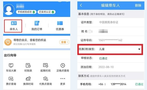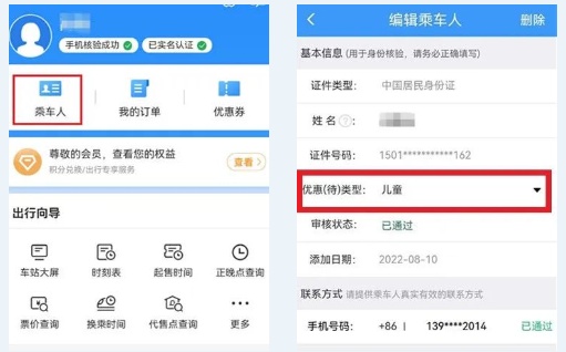 打开铁路12306手机App,点击“我的”,选择“乘车人”,添加乘车人信息,优惠(待)类型选择“儿童”。
