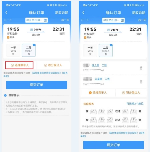 划重点:如果一名成年人旅客带两个不满6周岁孩子,那其中一个孩子可以免票,另一个需要购买一张儿童优惠票。