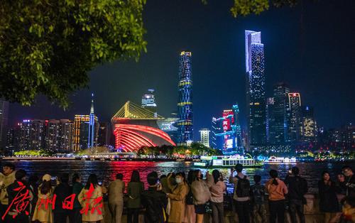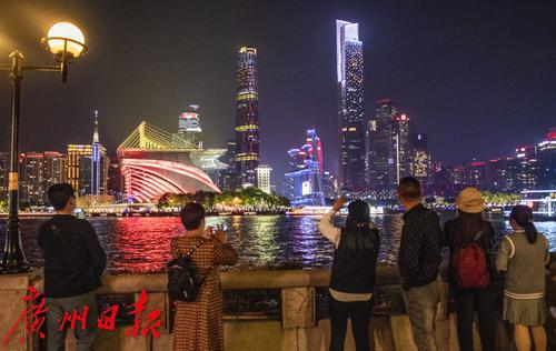 从珠江南岸眺望广州新中轴线珠江新城花城广场一带,只见灯光璀璨夜景如画,不少游人在此观景拍照。