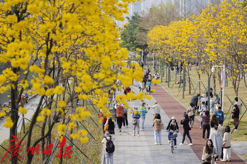 2月27日,磨碟沙公园的黄花风铃木在蓝天下怒放,一片金黄色的海洋让人瞩目。