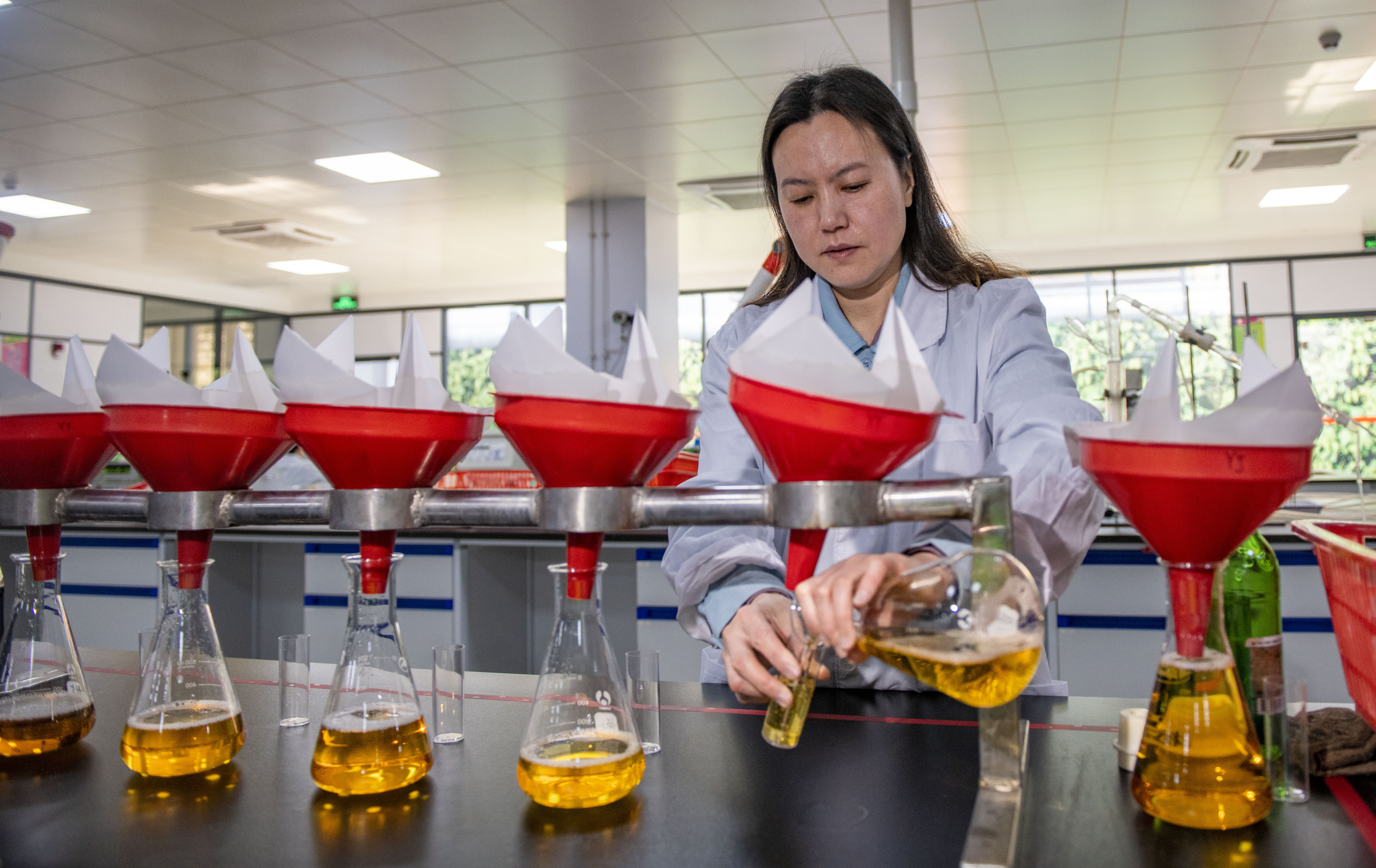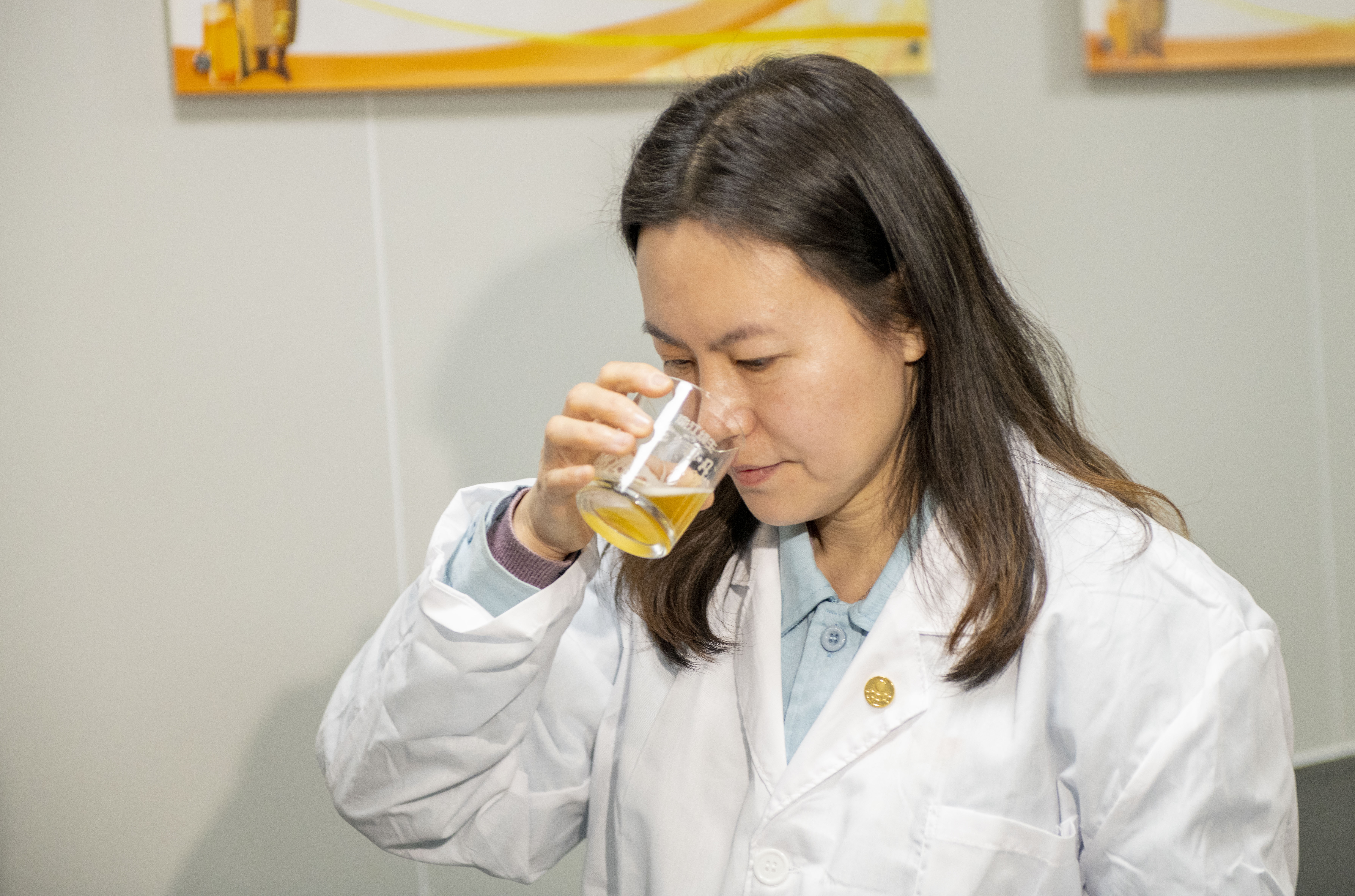 检测啤酒发酵液、给啤酒样品测总氧、检测啤酒样品的泡性持性……在珠江啤酒技术研发实验室,钟丽琴和她的同事们正在忙碌,一瓶啤酒生产过程中涉及的所有原材料都要经过她们的检测;随后,在隔壁的珠江啤酒钟丽琴技师工作室,钟丽琴和几位同事一起品酒,品鉴啤酒的风味;再稍晚些,她还去了公司啤酒品评培训现场给同事讲课。一个普通工作日的上午,钟丽琴需要在几个场所里不停穿梭。