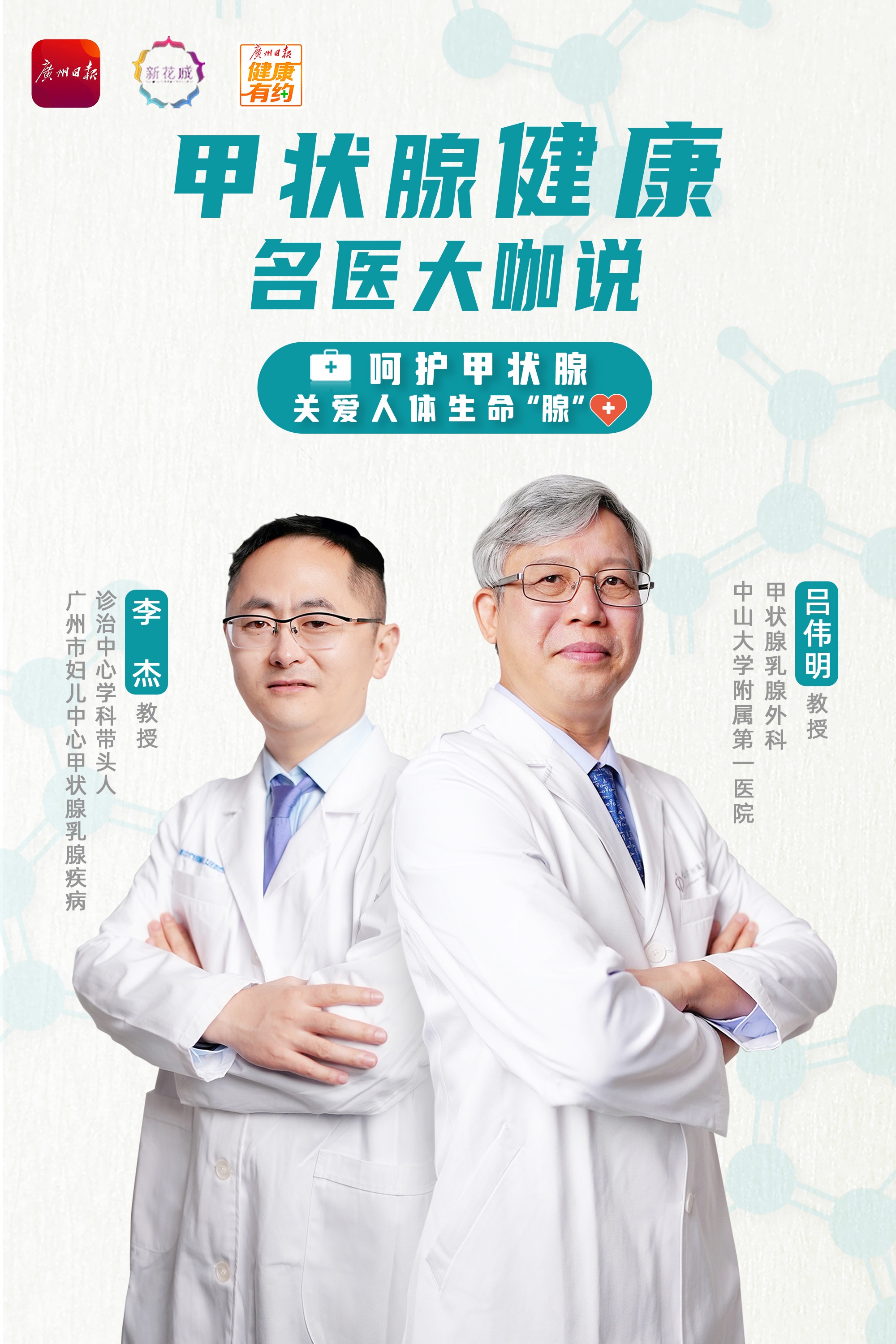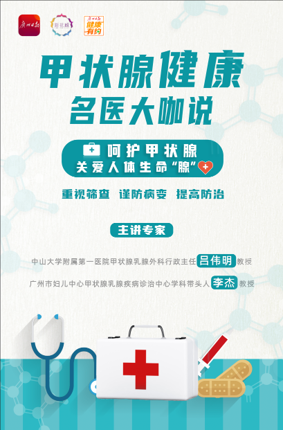 近日,围绕大家关心的甲状腺癌疾病诊疗话题,中山大学附属第一医院甲状腺乳腺外科吕伟明主任医师、广州市妇女儿童医疗中心甲状腺乳腺疾病诊治中心学科带头人李杰教授联合主讲一堂“名医微课”,为大家答疑解惑。