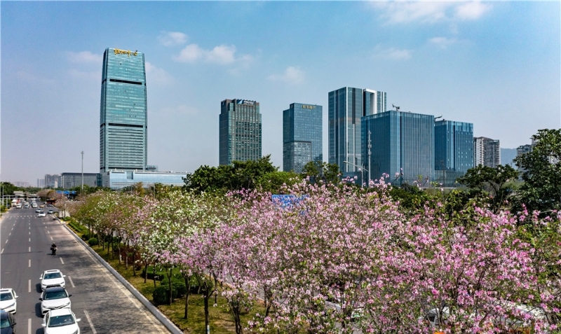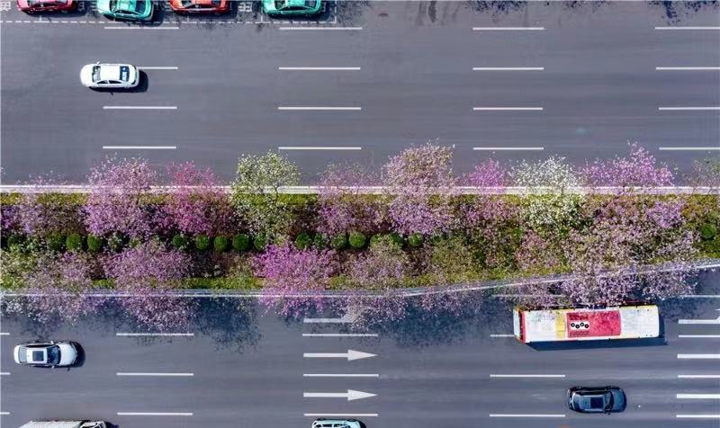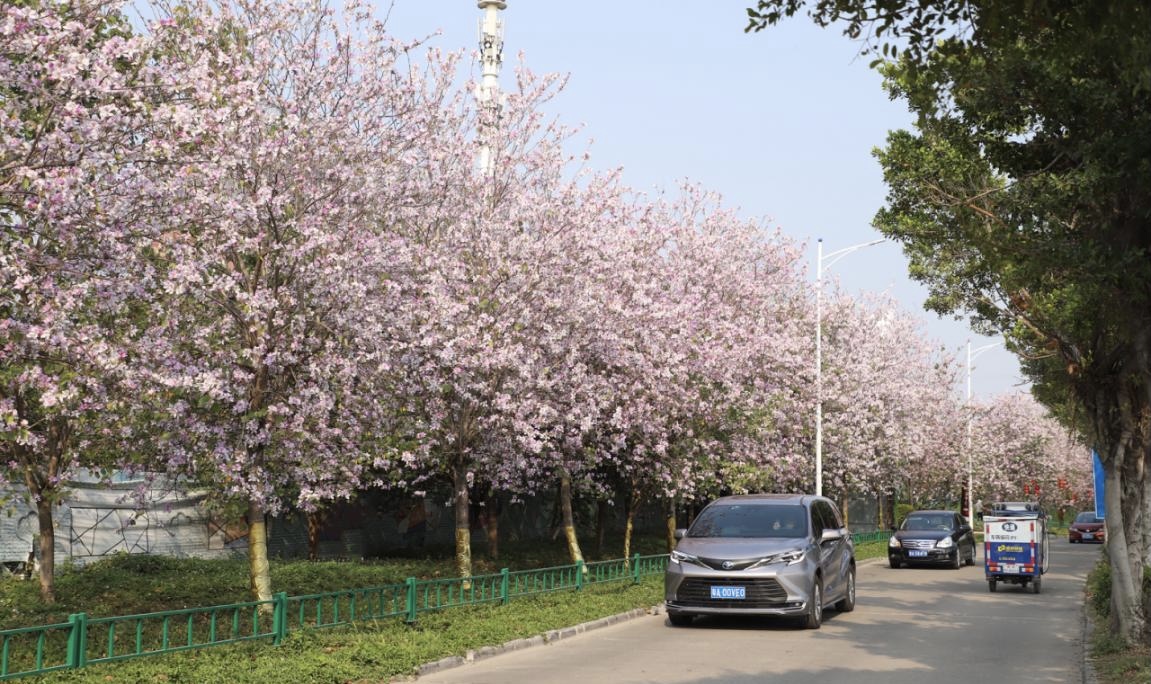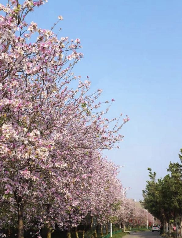 在白云新城的齐心路段,宫粉紫荆迎来盛放期,满树繁花似锦,红绿、白绿相映,延绵铺开,远远望去,展现一派春意盎然、生机勃勃的景象。沿着云城西路一路向北,沿途满是绽放的宫粉紫荆,成林成片,灿若霞云。市民开车经过或走路经过时,就可以欣赏到这一美丽春景。