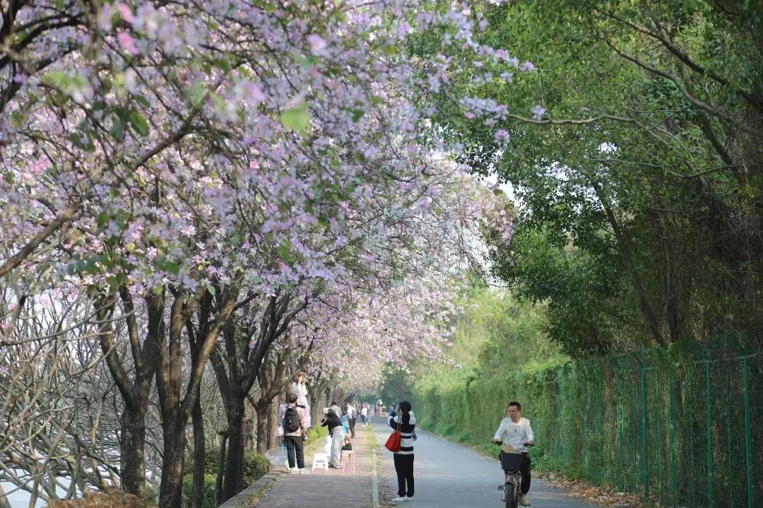 近日,番禺沙头街市桥水道沙堤路段岸边的宫粉紫荆开了,形成一条粉色的“紫荆花廊”,路过的市民们不禁驻足欣赏,纷纷拿起手机拍照打卡。