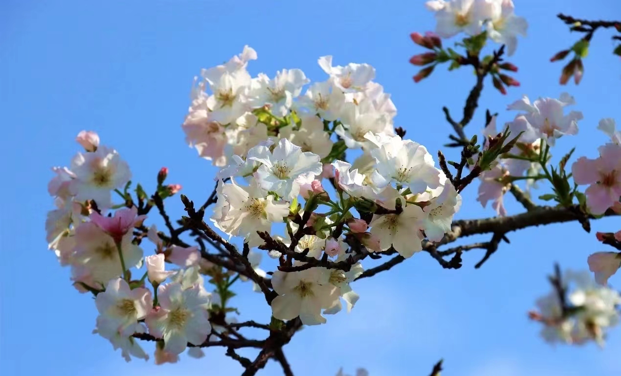 近日,占地面积近1000亩的天适樱花园景区内,中国红樱、貂蝉樱、西施樱、广州樱等近万株樱花竞相绽放。红色、白色、粉色的樱花灿若烟霞,一朵朵、一簇簇俏立枝头,与“从化蓝”交相辉映,格外亮丽迷人,构成了一幅幅美丽的春景图。