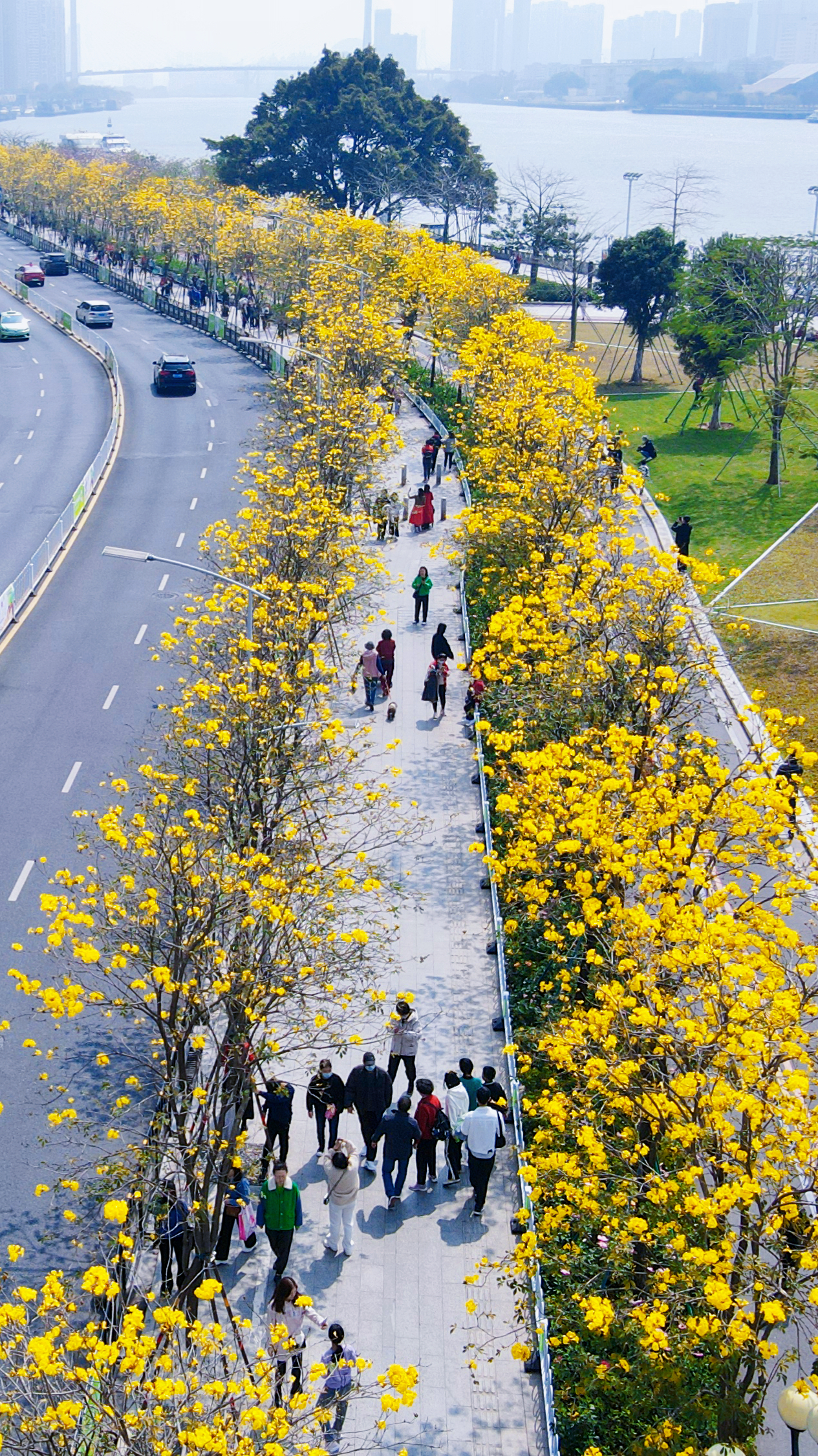 洲头咀公园旁边的环岛路上,长达几百米的黄花风铃木绚烂绽放