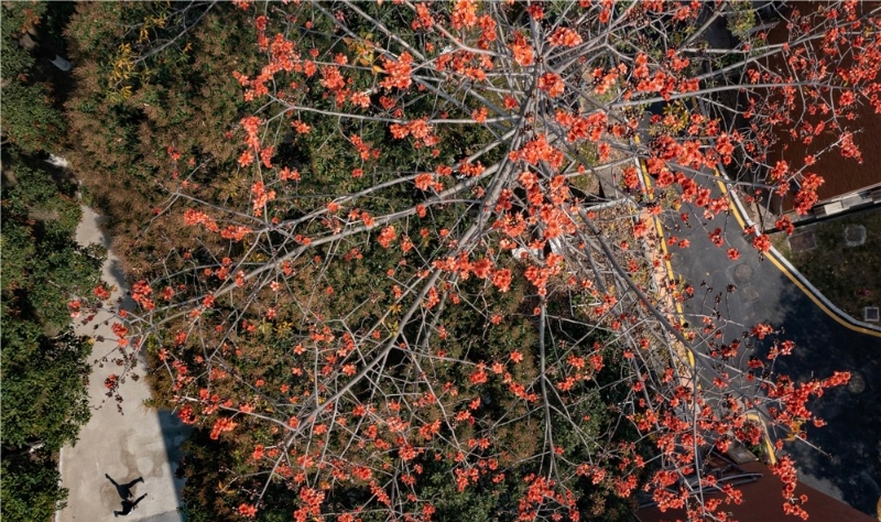 趁着二月春风绽放的,还有大街小巷的木棉花。在白云大道旁的广东外语外贸大学,在白云湖街夏茅村,高大挺拔的木棉树上,满树花朵鲜红似火,流淌春的热情。