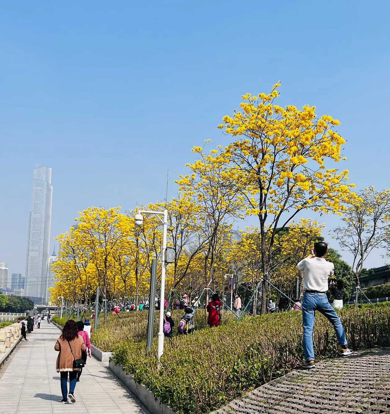 在海珠区洲头咀公园旁边的环岛路上,长达几百米的黄花风铃木绚烂绽放。众多市民游客在树下打卡拍照,欣赏这幅金色的自然“油画”。除了环岛路,在海珠区磨碟沙公园、磨碟沙路、科韵路(阅江路-新港东路)、东晓路等地也能观赏到黄花风铃木,预计3月初会进入盛花期。黄花风铃木的花期不长,请千万别错过哦!