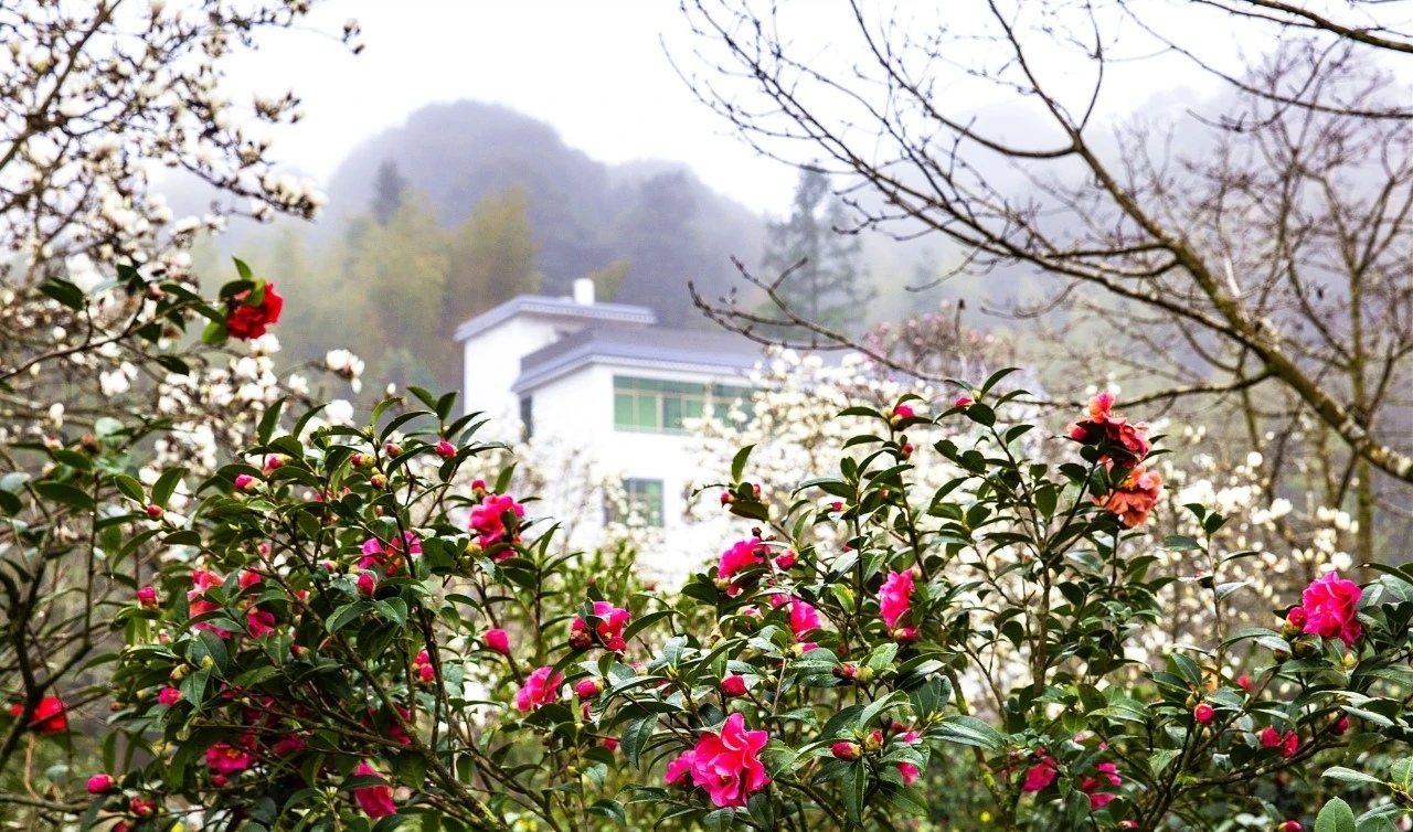 同时,园区还种植了木兰、玉堂春等多种花卉。缤纷的茶花、清丽的玉堂春、金黄的油菜花与古朴乡村建筑相映成趣,构成了一幅烟雨江南的山村风景图。