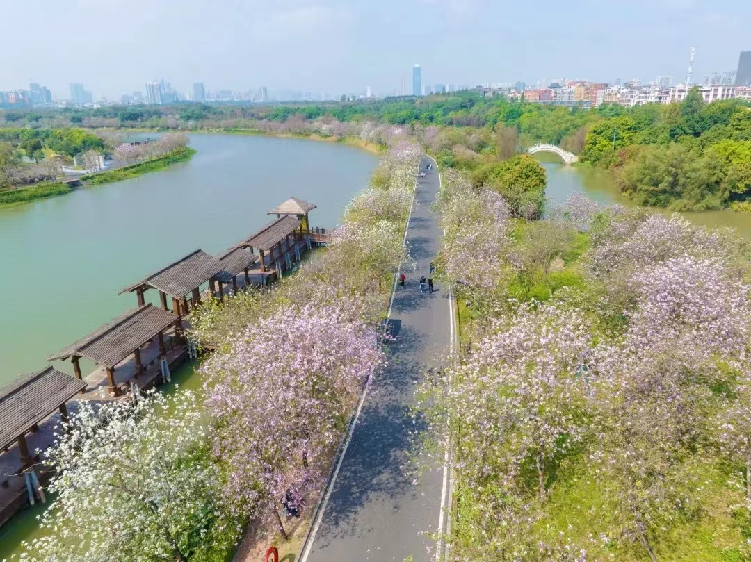 据悉,自2018年以来,沙头街新增城市绿化面积约48878万平方米、城市绿道约14公里,其中部分就是在沙堤路以及路旁的莲湖湿地生态公园。粉色的“紫荆花廊”就是由坐落于此的958棵紫荆树组成。游客们赏花时可以从景观桥底的沙堤路入口进入,沿河游览,驻足莲湖生态公园后,继续向前行走至市桥三桥桥底,全长约3.7公里,步行约1小时。