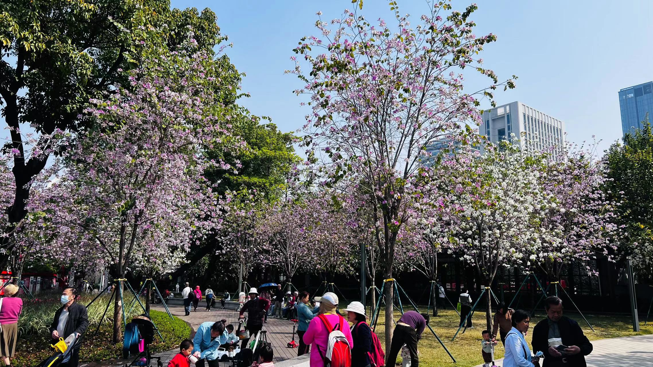 白云新城的广州市儿童公园内,目之所及,紫花风铃木、簕杜鹃等各色花木也是竞相绽放,吸引众多市民游客驻足观赏、拍照打卡。