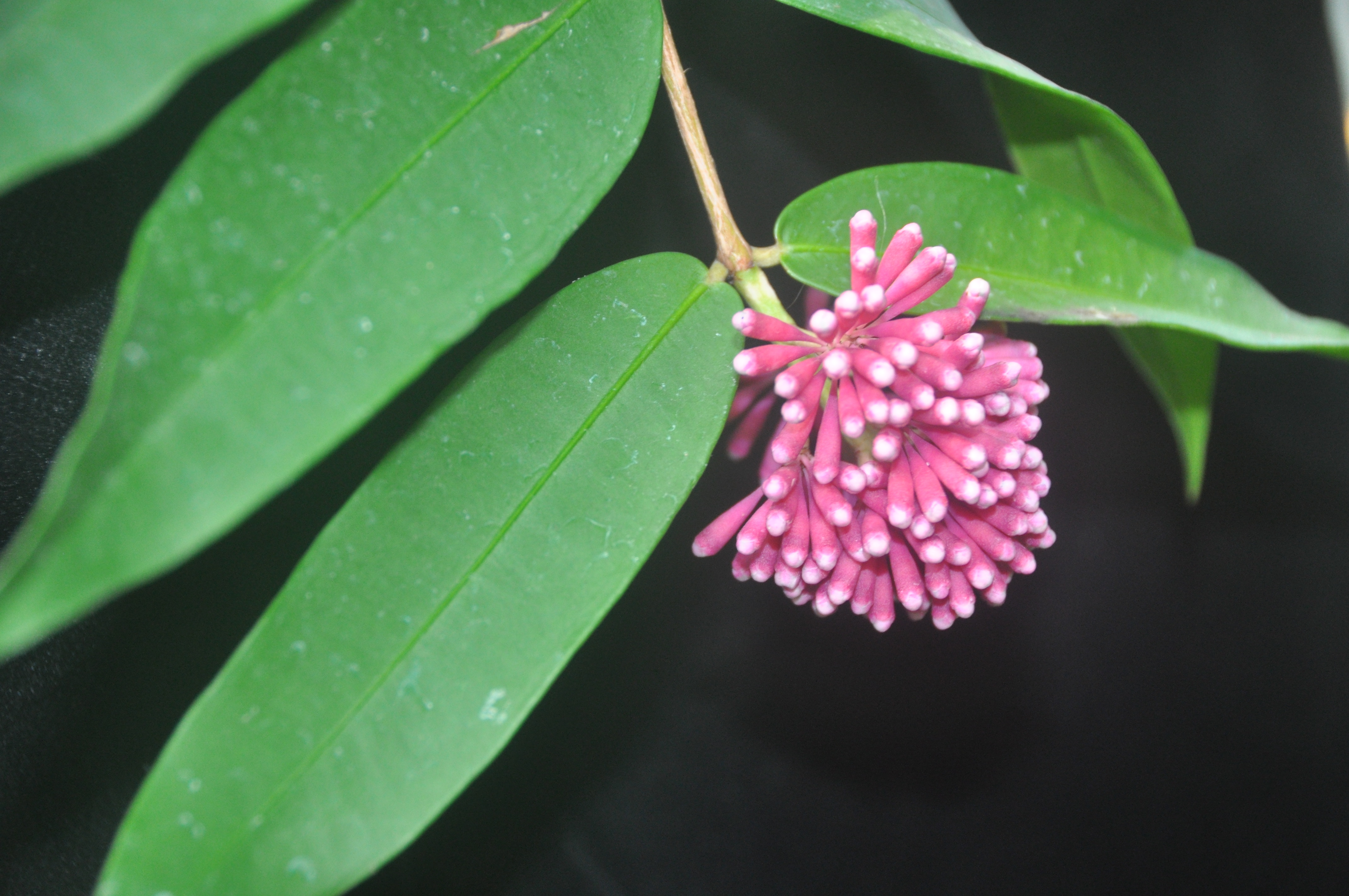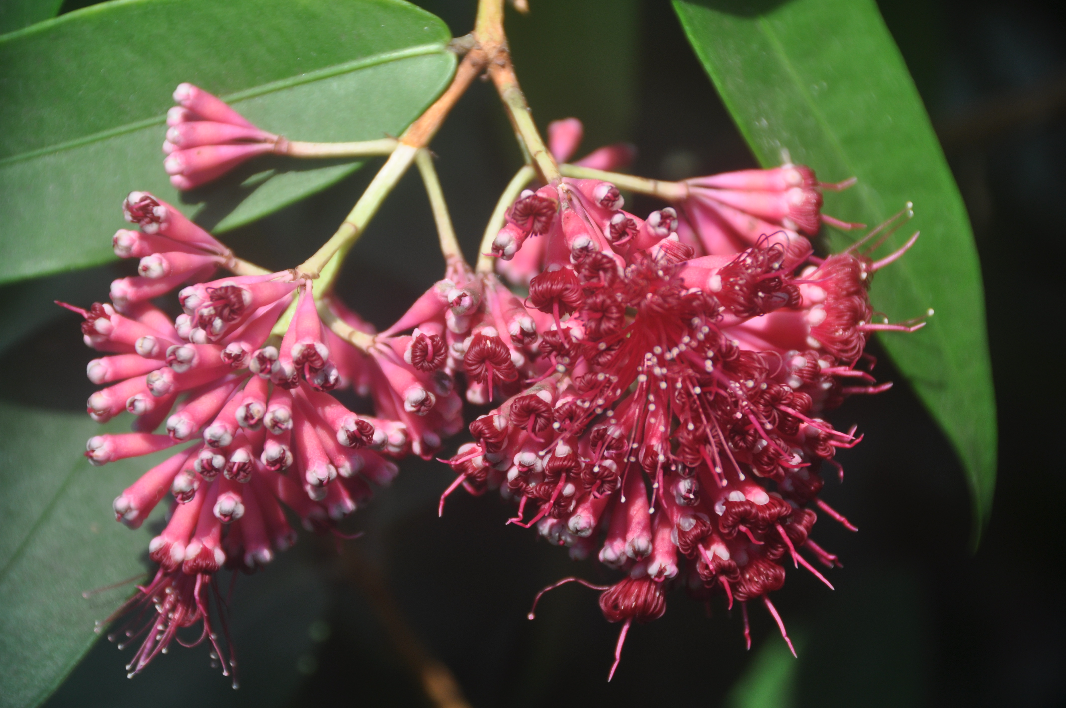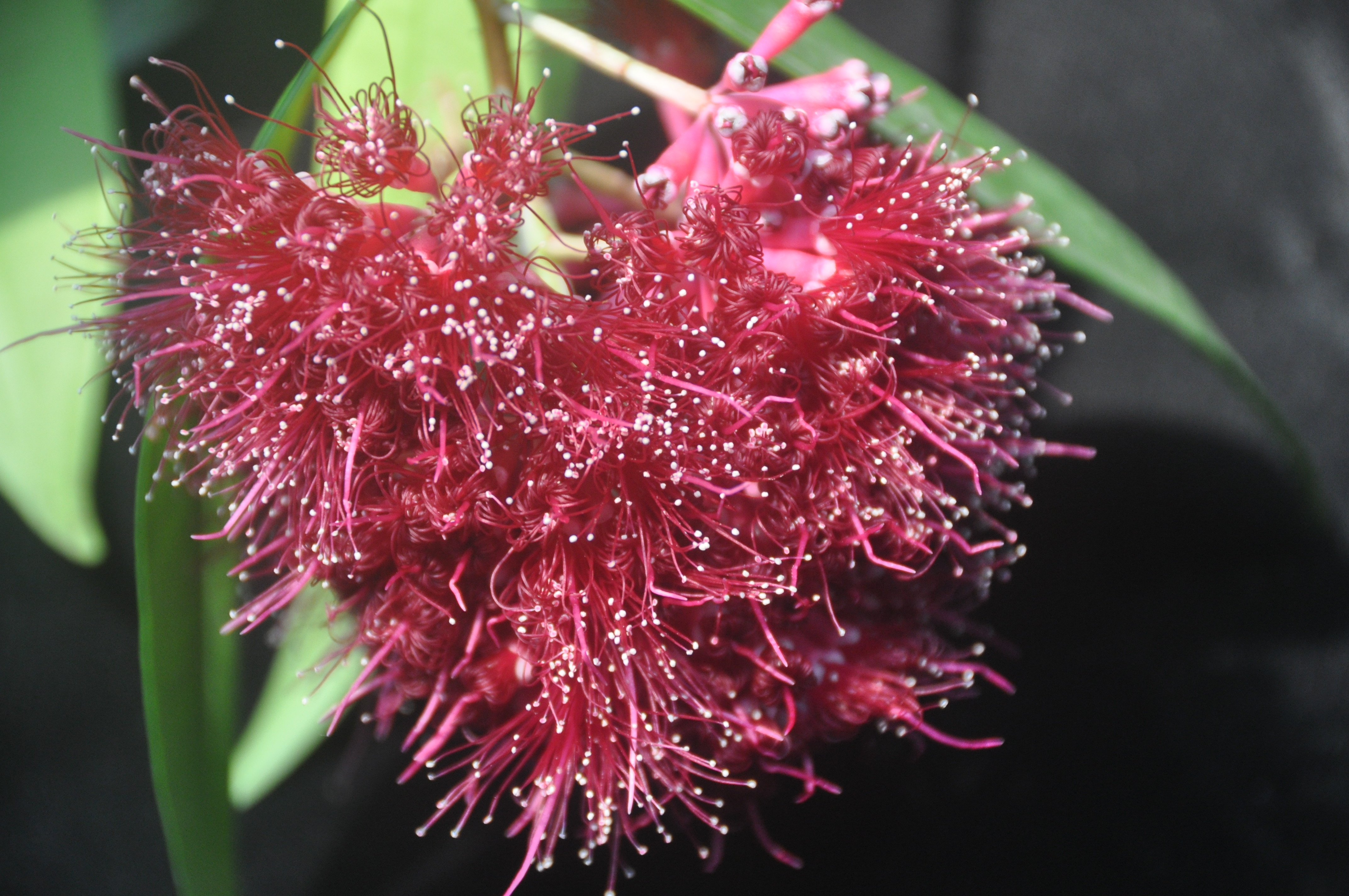 威尔逊蒲桃的花朵更是犹如绽放的烟花,毛茸茸、像啦啦队彩带球一样的半球,看上去有点像豪迈奔放的朱缨花,红得浓烈又大气。花朵未开放时,花蕾呈细长圆柱状排列成簇状;开放时数量极多,细长鲜红色的花丝向外伸展,丝丝放射。