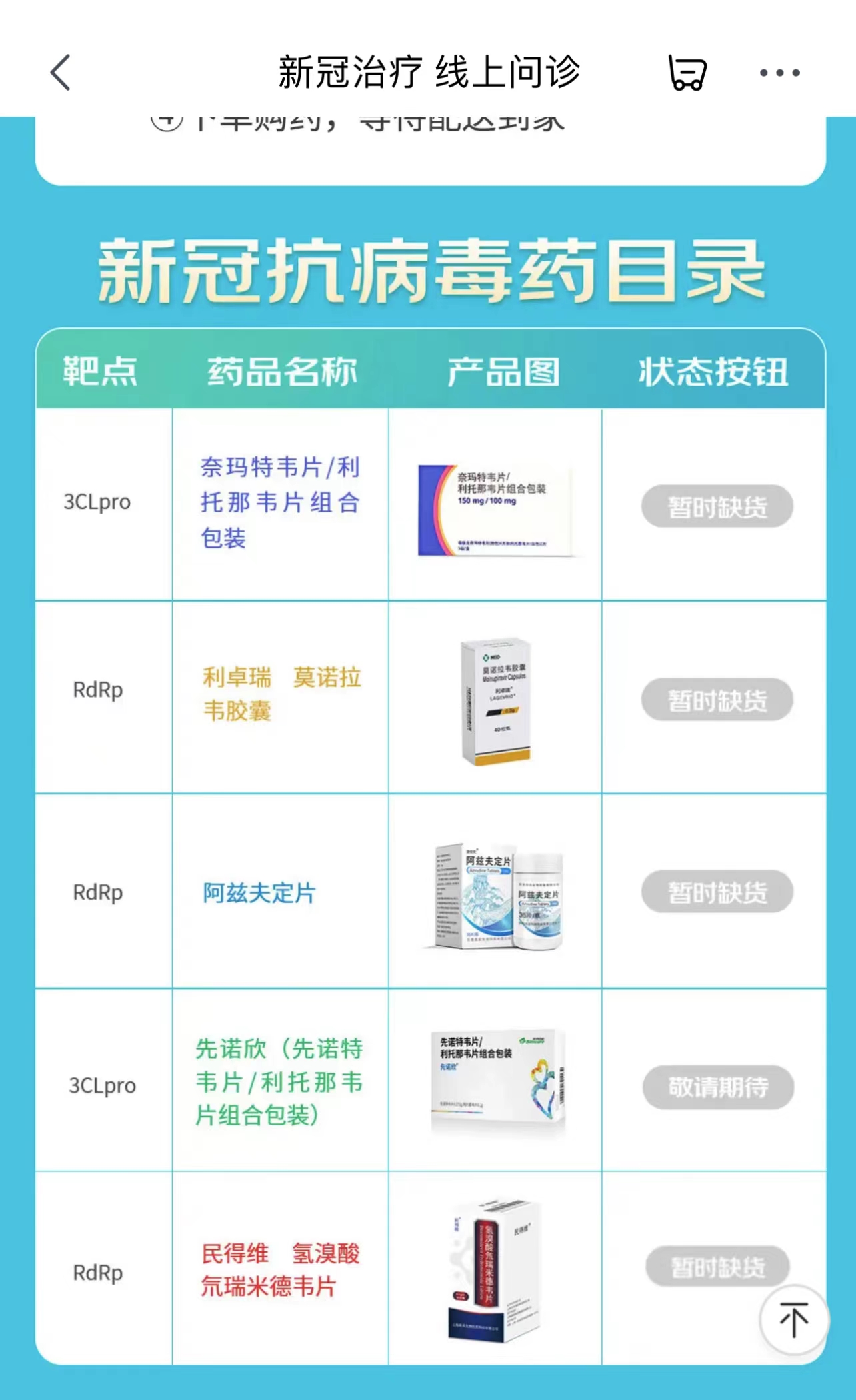 3月2日,记者从京东健康“新冠治疗 线上问诊”页面看到,不单是先诺欣、民得维,还有此前货量较为充裕的辉瑞的Paxlovid、真实生物的阿兹夫定以及默沙东的莫诺拉韦均显示暂时缺货。