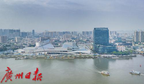 航拍白鹅潭商务区核心片区,右边为立白大厦,左边为建设中的白鹅潭大湾区艺术中心。