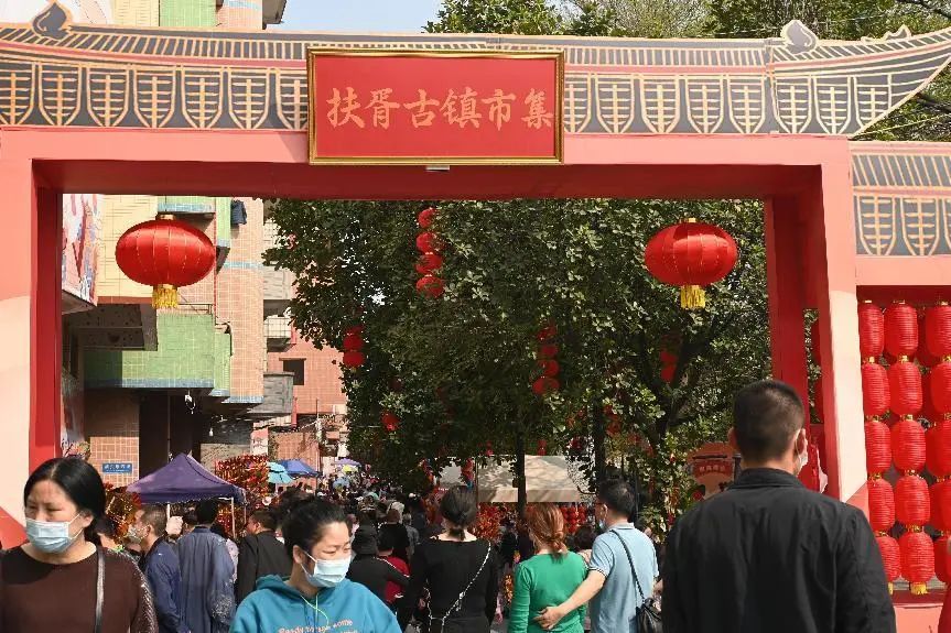下午,在南海神庙东门外的“扶胥古镇市集”上,各式各样的摊位组成了一条丰富多彩的“民俗文化一条街”。有香喷喷的波罗粽、有色彩鲜艳的波罗鸡,还有各种波罗诞庙会相关的文创作品及传统国风饰品售卖,长长的街道游人如织,欢乐的喧嚣回荡在南海神庙东侧上空。