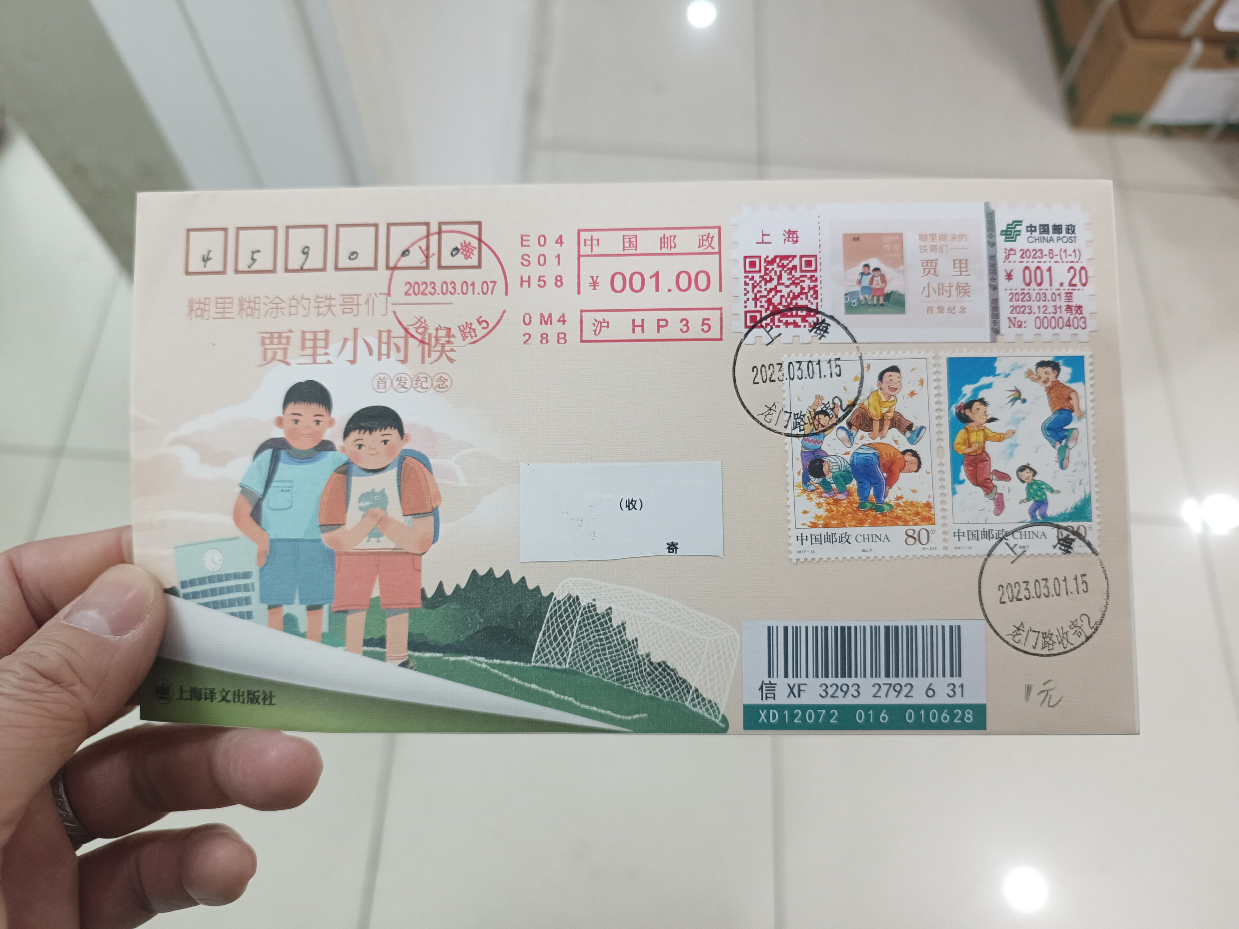 2023年3月1日,一枚首次以中国原创儿童文学人物形象发行的邮戳在中国共产党诞生地主题邮局正式启用,那就是中国邮政和秦文君作品《稀里糊涂的铁哥们——贾里小时候》联名的纪念邮品。满心期待的大小读者们听到消息一大早就来到邮局门口排队等待,上千份首发邮品发售后立刻被抢购一空。