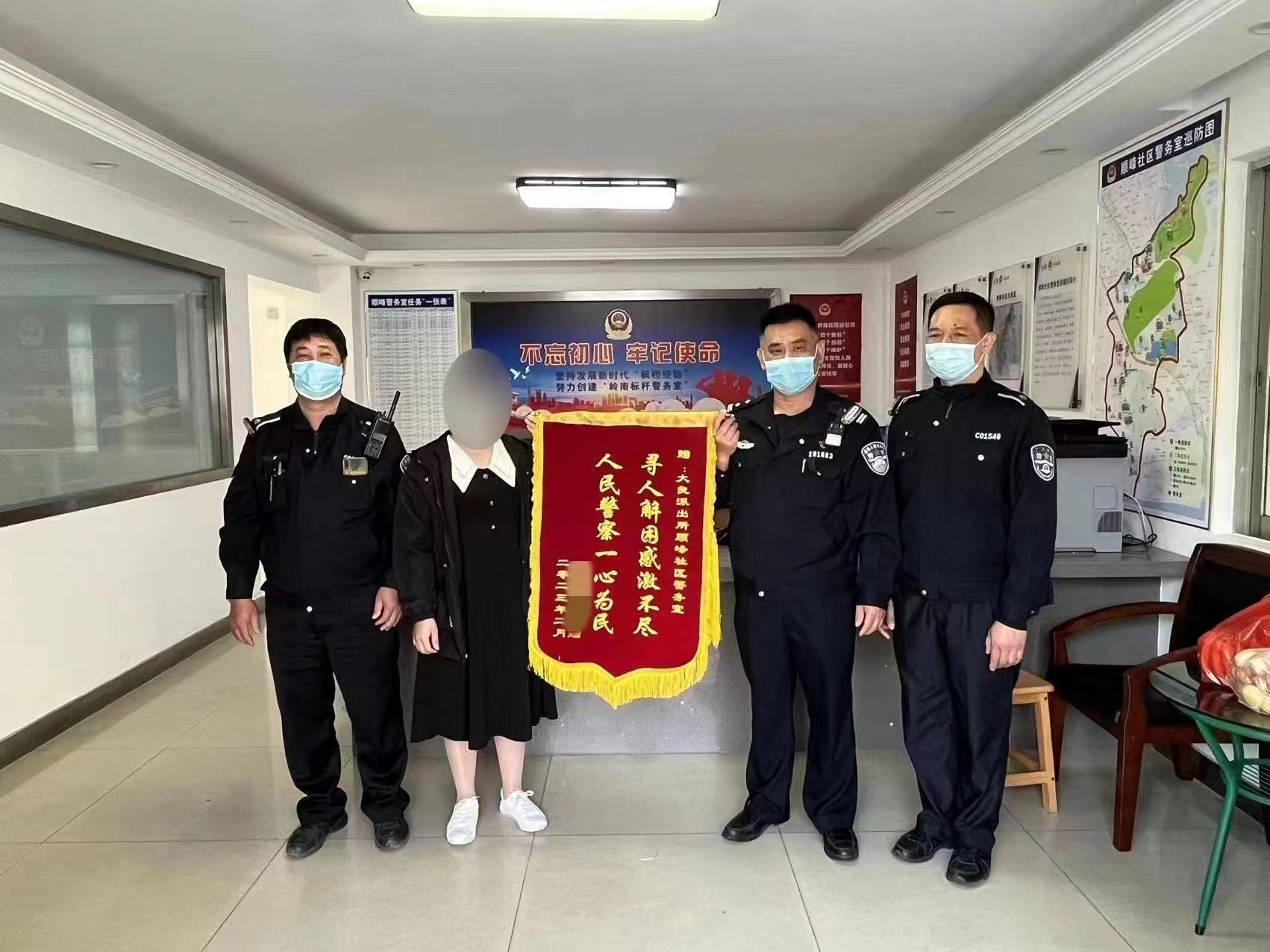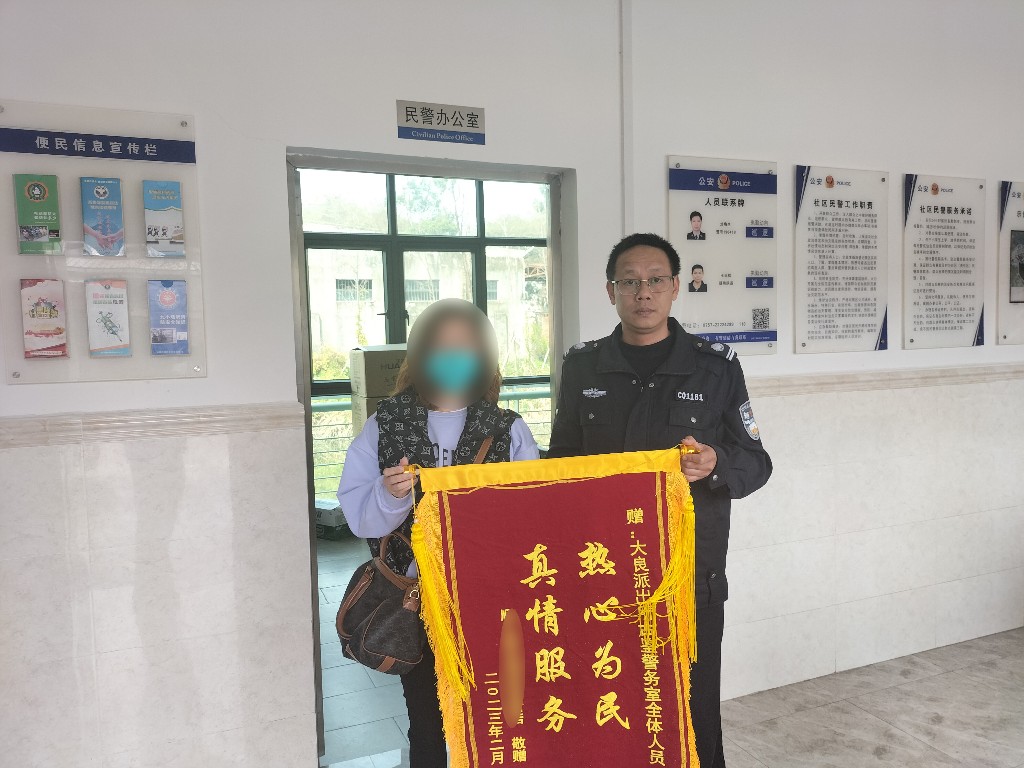 2月19日早上,钟女士将一面印着“寻人解困感激不尽,人民警察一心为民”的锦旗送到顺峰警务室警辅人员手中,感谢警辅人员尽心尽力及时为其排忧解难。