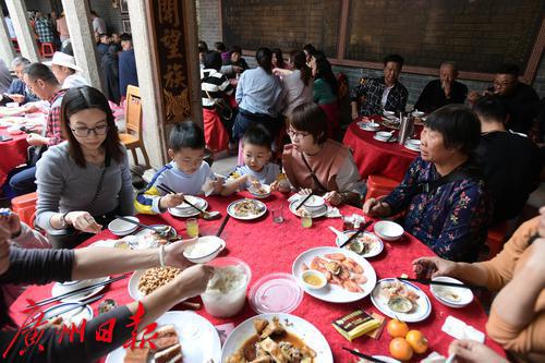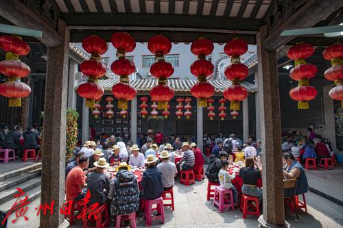 图为乡民在祠堂设宴,大家齐聚共叙乡情。