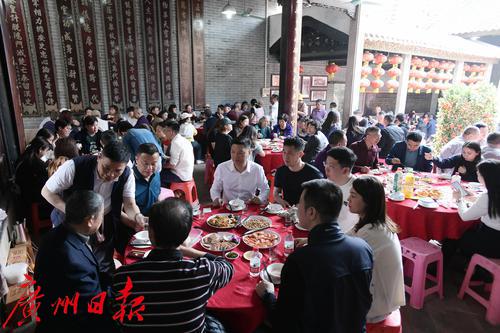 3月4日,上午“五子朝王”活动结束之后,在位于黄埔区穗东街道庙头村的张氏大宗祠内,众多庙头村村民前来参加“流水席”,场面蔚为壮观。据流水席现场负责人介绍,“流水宴”已开宴三天,“正诞日”当天有400多围桌。在庙头村,“流水宴”的传统至今已持续十几年,每年“波罗诞”村里人都会邀请亲朋好友齐聚一堂吃一顿团圆饭,已经成为“波罗诞”千年庙会中一项极具仪式感和乡土味的活动,对于增进村民感情、推动邻里和谐起到重要作用。
