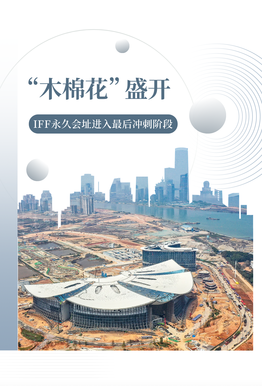 作为项目核心,国际会议中心建筑面积约16.65万平方米,建筑高度约50米,屋面结构为空间桁架结构体系,以纯白的金属屋面和装饰铝板为“花瓣”,以玻璃采光屋顶为“花蕊”,共同构成了一朵盛开的“木棉花”。