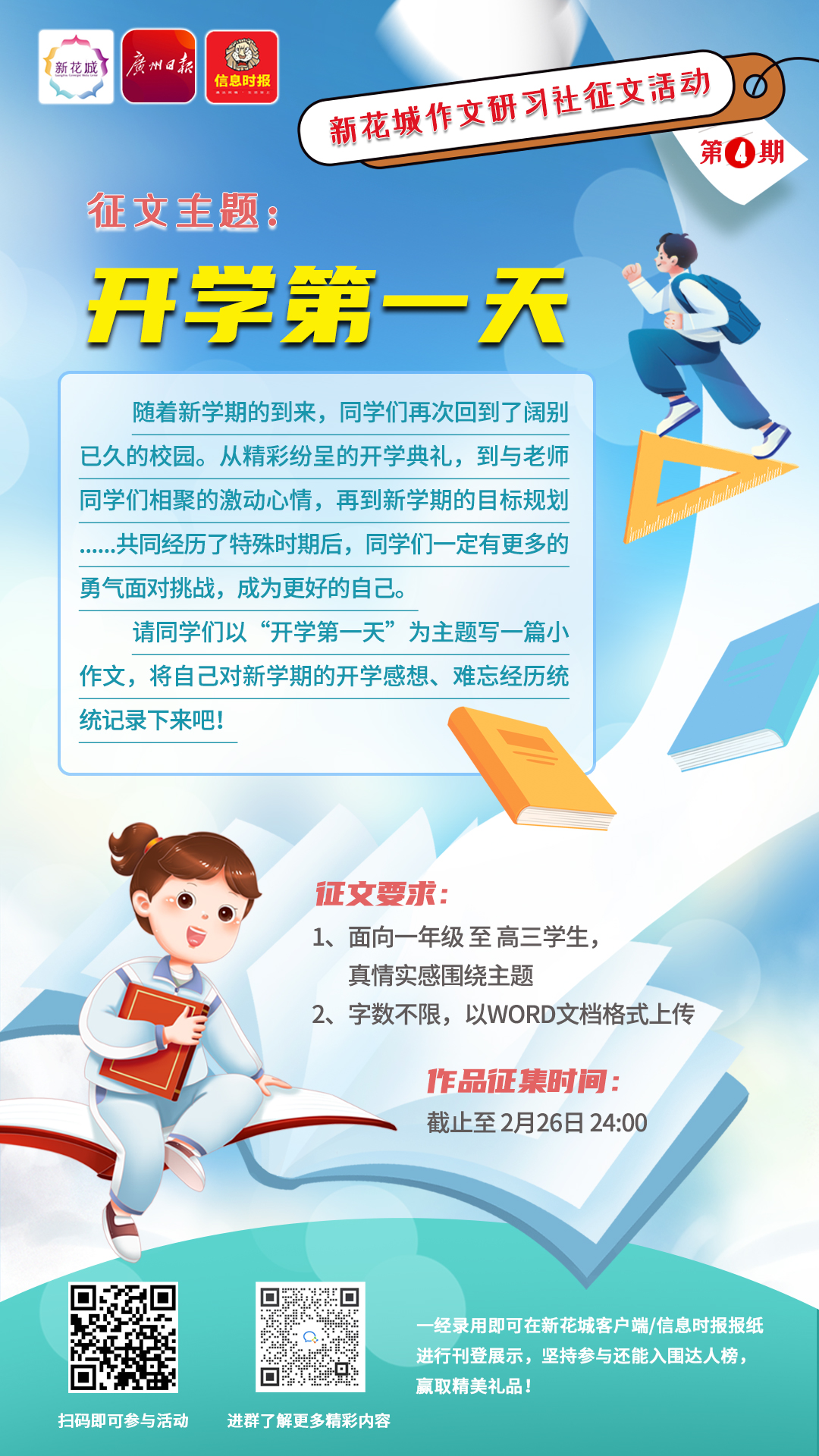 新学期开学,同学们再次回到阔别已久的校园。为了鼓励同学记录新学期的感想与寄望,今年2月10日至2月26日,广州市区融媒云平台“新花城”联合信息时报《天天向上》专栏,发起了以“开学第一天”为主题的第四期作文征集活动!