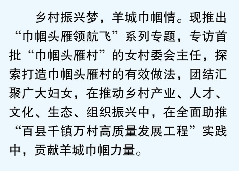 广州市妇联在增城区召开创建巾帼头雁村工作座谈会时强调,头雁村女书记要履职尽责,主动连接各方资源,积极争取政策支持,做好困难群体兜底保障工作,以更奋发有为的姿态诠释使命担当,为新时代再立巾帼新功。