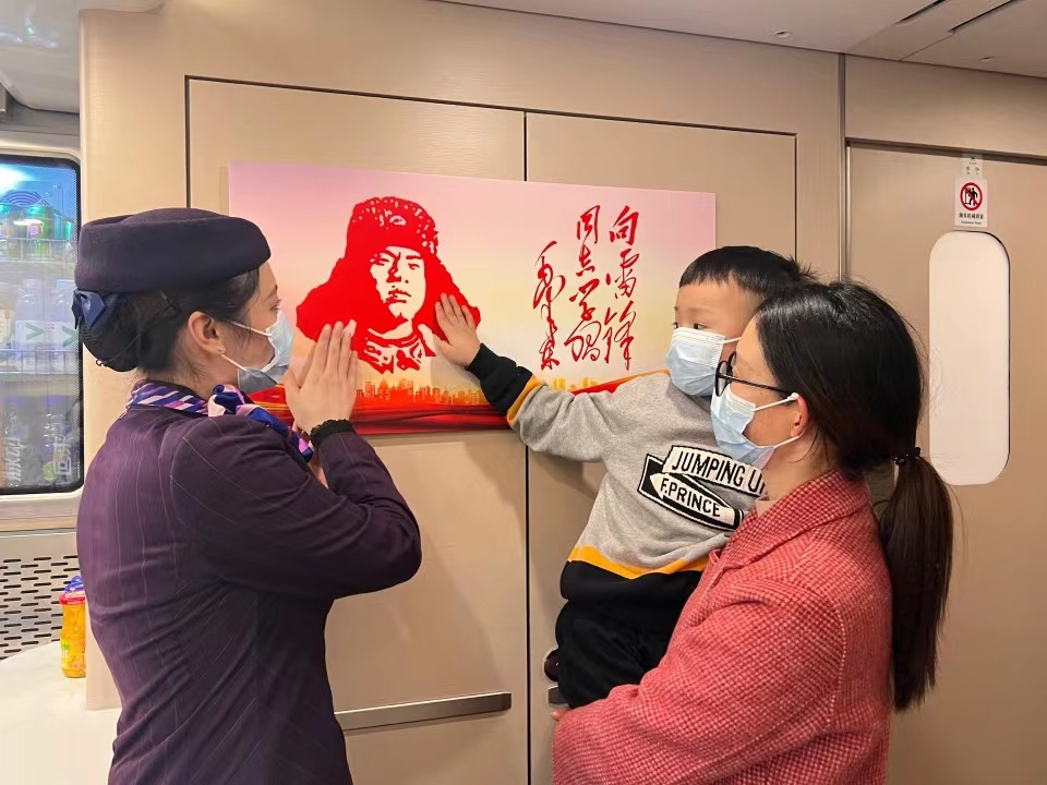 通过这次活动,孩子们更加直观生动地了解了雷锋是谁,在心里种下“雷锋精神”的种子。旅客胡女士的儿子俊俊今年四岁半,胡女士说:“当高铁车厢里响起《学习雷锋好榜样》的歌声时,俊俊第一次认识了这位乐于助人、为人民服务的雷锋叔叔。”