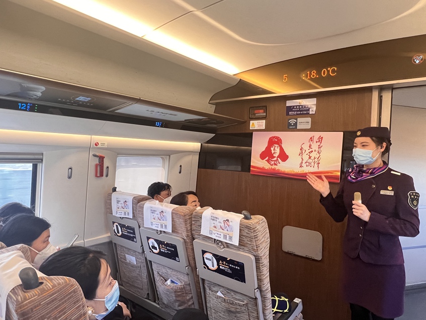 今年是第60个“学雷锋纪念日”和第24个“中国青年志愿者服务日”,在3月4日学雷锋纪念日,广铁集团广九客运段高铁动四车队列车长刘豪,一早带领班组以“向雷锋同志学习”为主题精心布置好了车厢。从广州南站开车后,刘豪走进车厢,唱起了《学习雷锋好榜样》,并生动地向旅客们讲述雷锋的生平和光辉事迹,现场旅客听得十分着迷。
