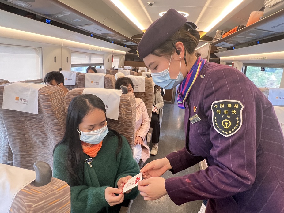“太感谢你们了,一路送我到车厢,还将行李摆放好,真的帮了我一个大忙。”旅客王奶奶说。