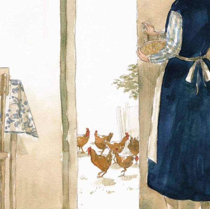 插画家奥迪隆·莫赖斯的水彩风格插图勾画出母鸡劳拉庸常而宁静的生活,与叙事的气氛完美结合。坐在打字机前的李斯佩克朵本人是贯穿整个故事的亮点,有意无意地揭示身为母亲的她与母鸡劳拉之间存在着某种联系,巧妙地体现出作品的耐人寻味。