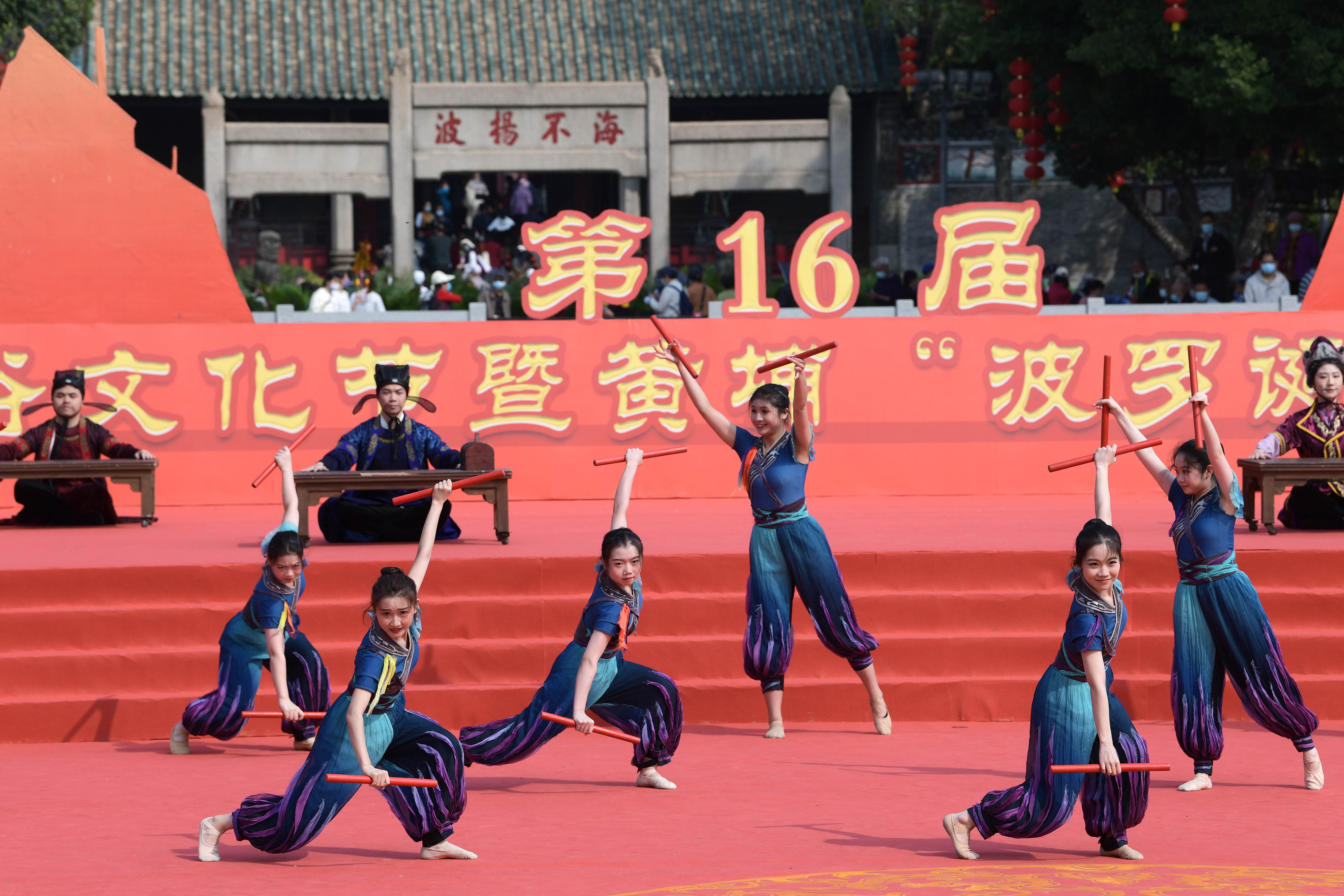 A dance performance is organized at the Boluodan Temple Fair to commemorate the legendary birthday of the South China Sea god. (Photo by Yang Yaoye/Guangzhou Daily)