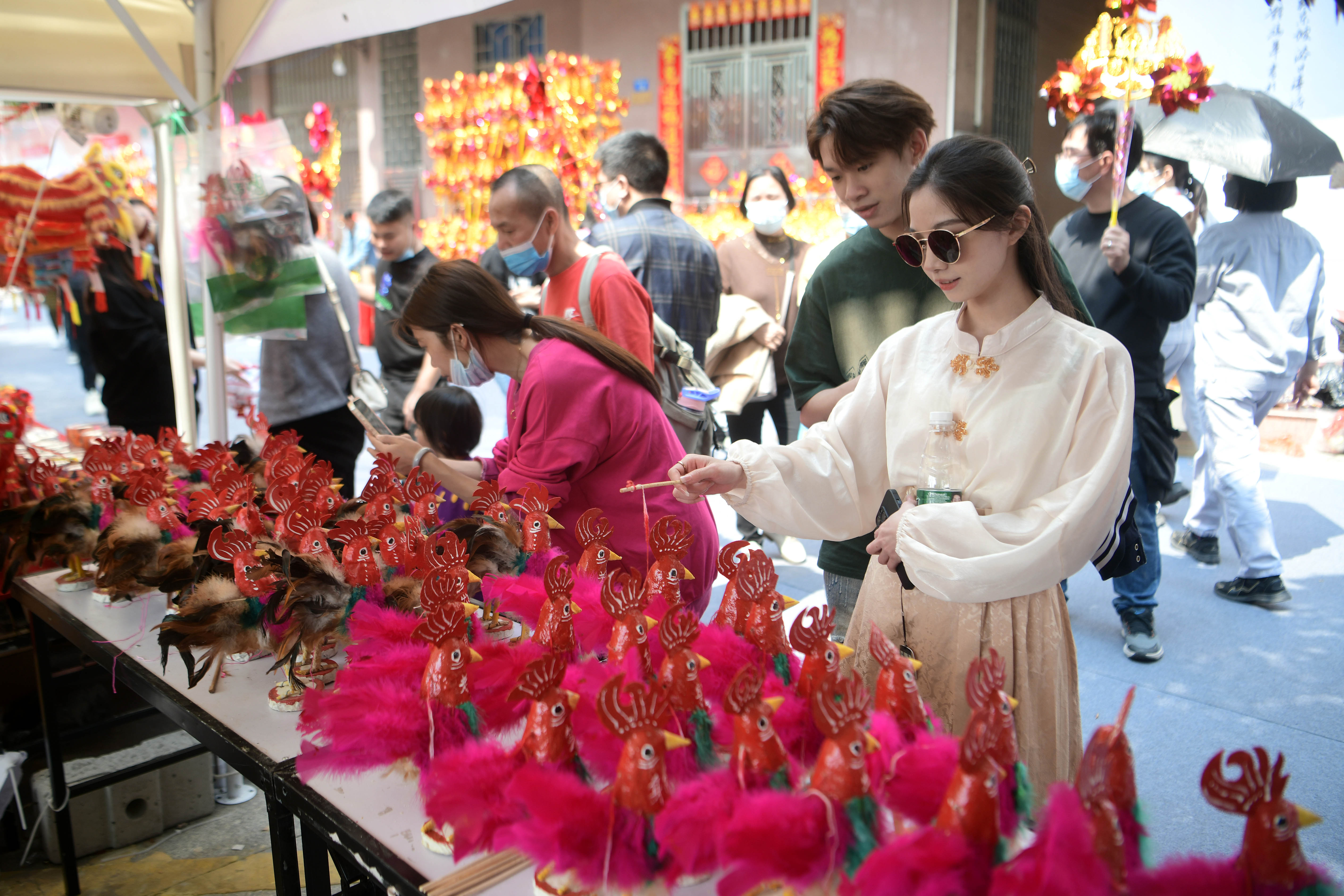 Boluo chicken (rooster), a handicraft sold especially during Boluodan Temple Fair, is welcomed by visitors. (Photo by Yang Yaoye/Guangzhou Daily)