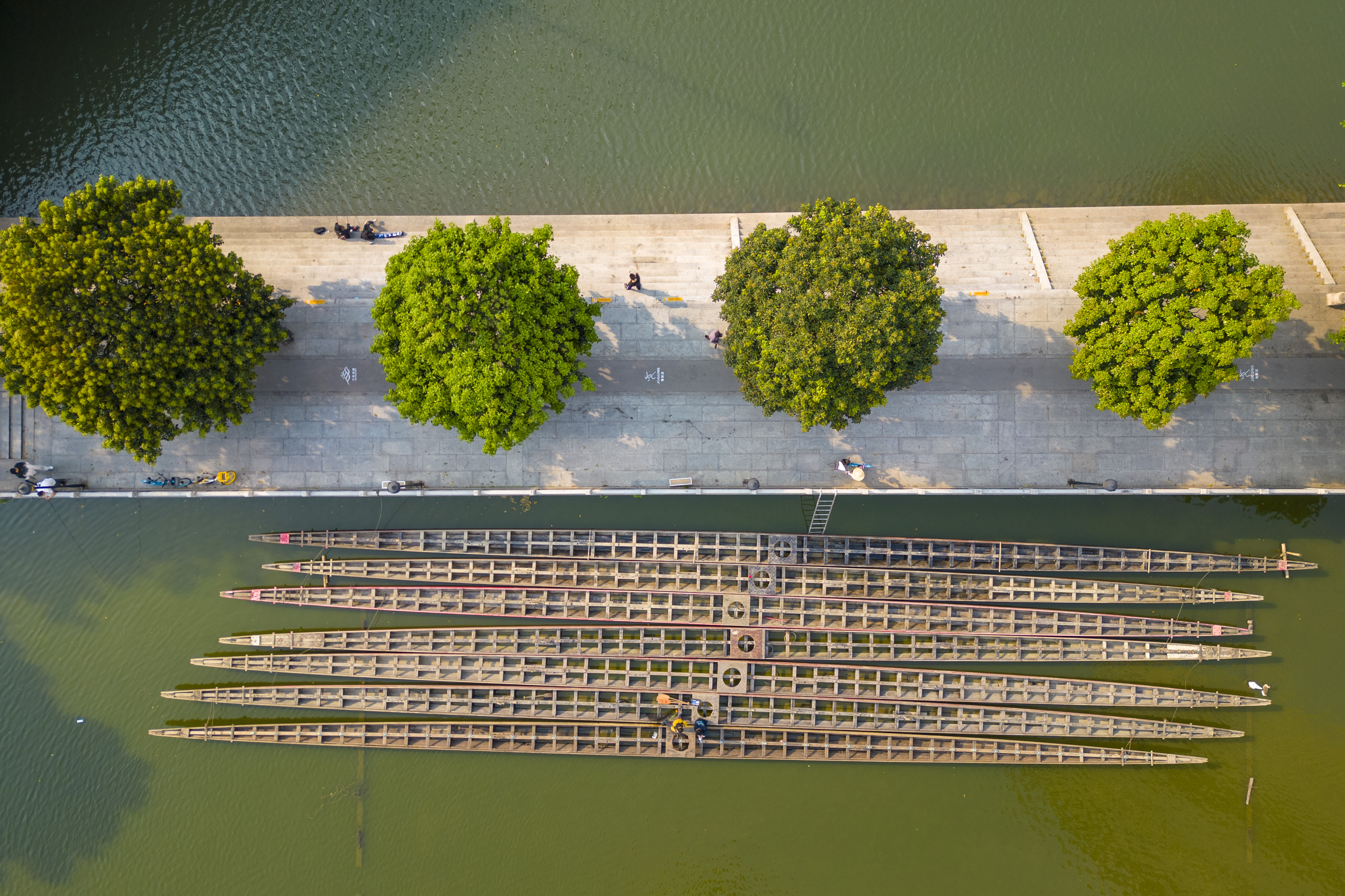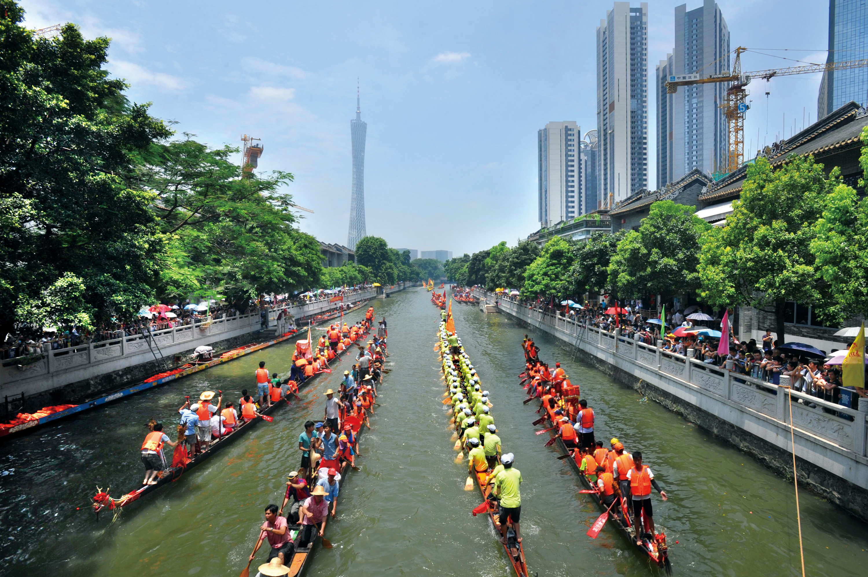 猎德涌上,静待参加端午竞渡的龙舟。