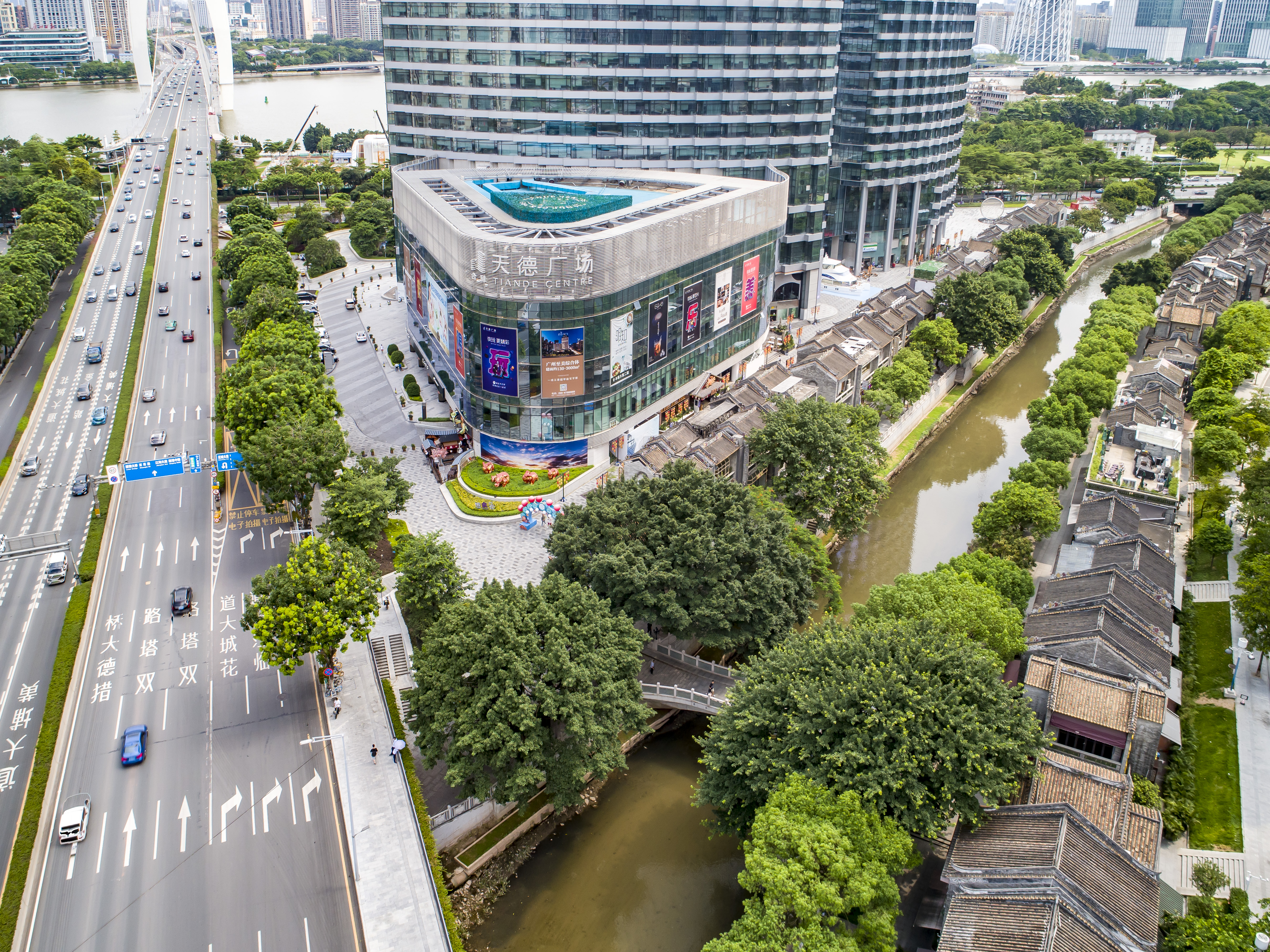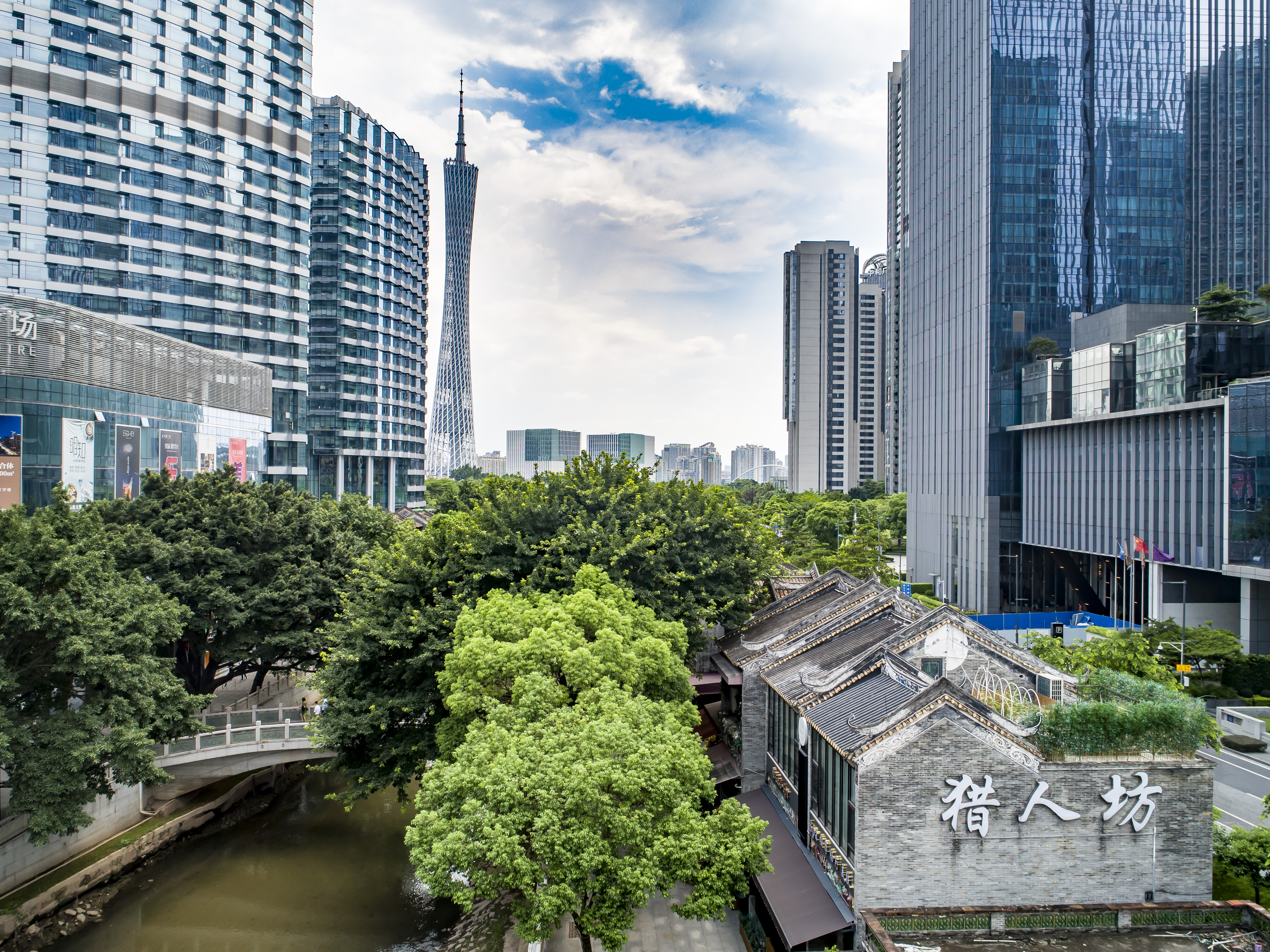 跨过猎水桥,就到了猎德东村,向左穿过猎德大桥下的民俗文化长廊,眼前豁然开朗,正前方是一栋栋高耸的回迁住宅楼,左边是清澈的猎水,直流而下,汇入珠江,右侧是猎德人的精神家园——古村宗祠群、古文化街、古庙宇区。这些颇具岭南特色的建筑、雕塑等虽多为新建,但浓缩了岭南古村气息,融入新城肌理,与远处的猎德大桥、广州塔等地标相互辉映。