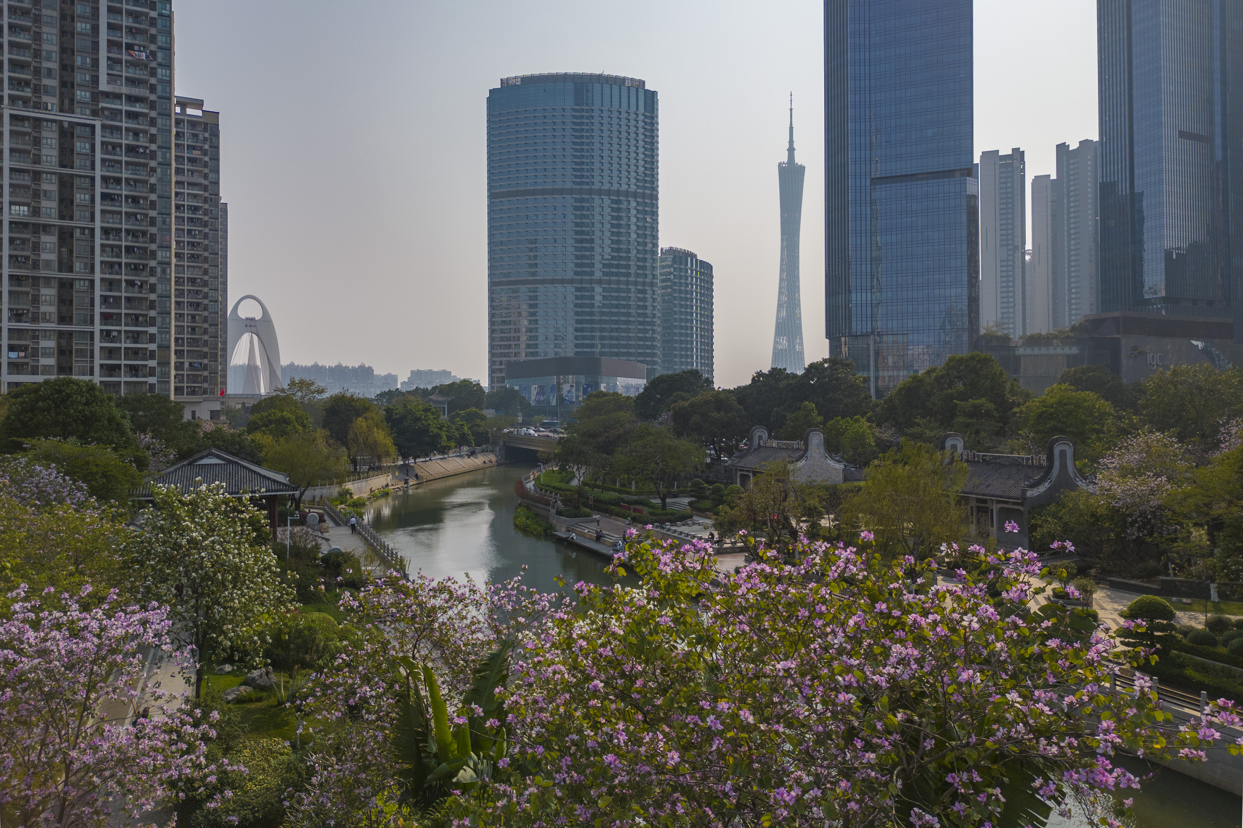 猎德涌潺潺流过,两岸树木青葱,绿意盎然。