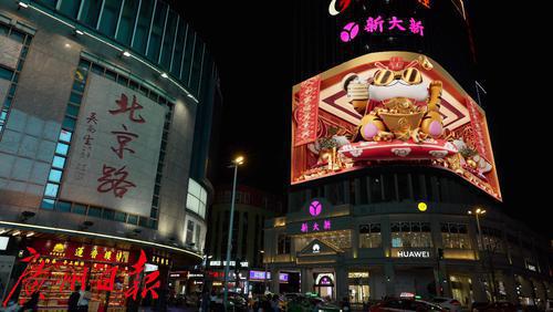 图为广州北京路8K裸眼3D大屏正式启动,其通过8K高清晰度、超沉浸感的绚丽视觉效果为裸眼3D视频带来最大化的视觉冲击力,众多市民打卡。