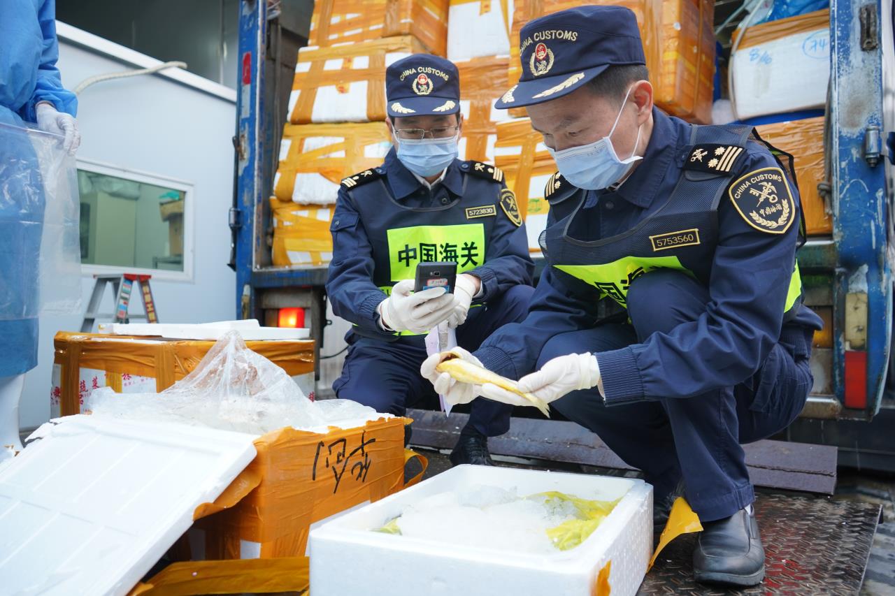 「1.1噸冰鮮馬頭魚、0.6噸冰鮮黃花魚、0.65噸冰鮮蝦……總共60多個品種8.5噸,我們對這批冰鮮水產品採用的是「三聯三同」監管模式。」拱北海關所屬香洲海關查檢科李霖和同事一邊核對清單,一邊對產品的品質進行感官檢驗。幾個小時後,這批冰鮮水產品便可進入澳門各大市場供市民選購。